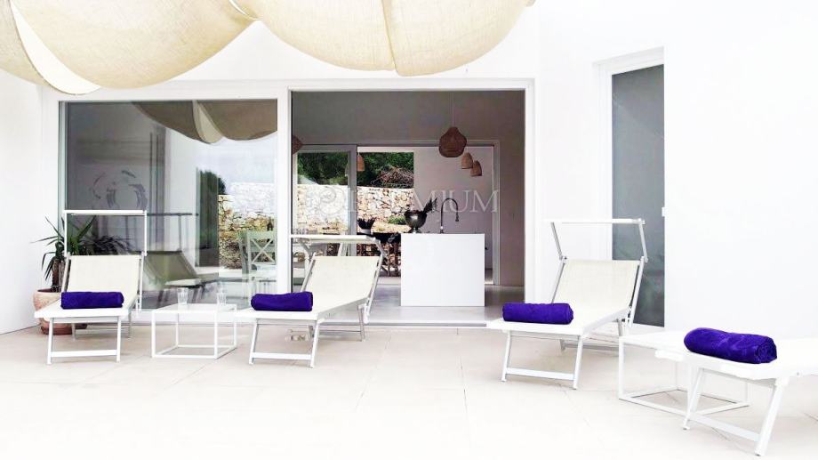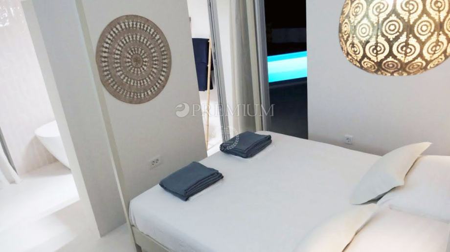 U centralnom dijelu objekta nalazi se prostrani dnevni boravak, kuhinja i blagovaonica s izlazom na natkrivenu terasu s jedne strane, a s druge izlaz na sunčalište i bazen (10x3 m). U desnom dijelu kuće nalazi se soba s vlastitom kupaonicom, toalet i spremište. U lijevom dijelu nalaze se 2 spavaće sobe, svaka s vlastitom kupaonicom.