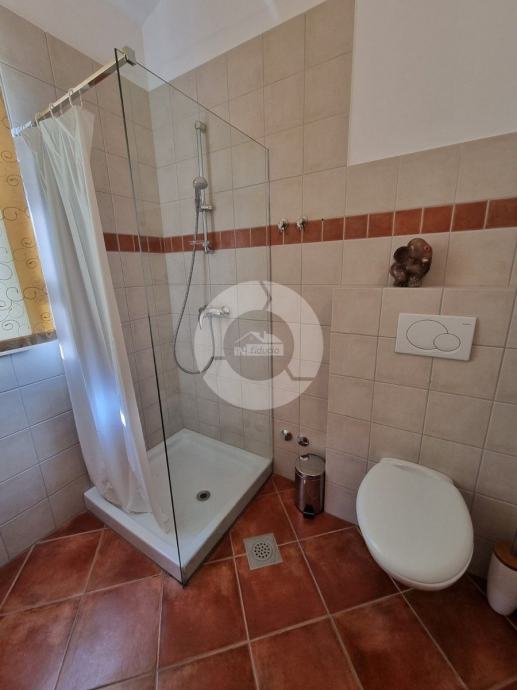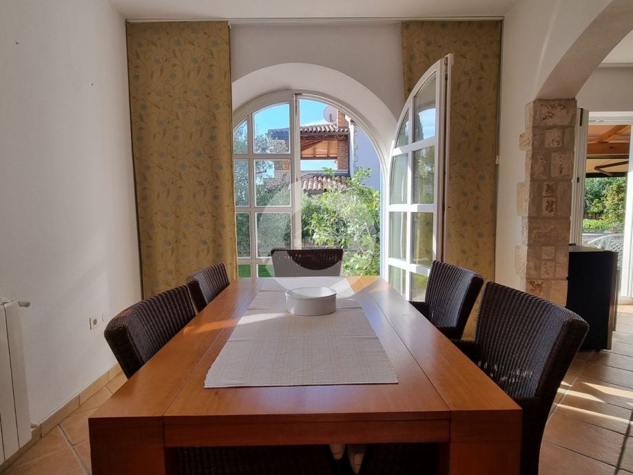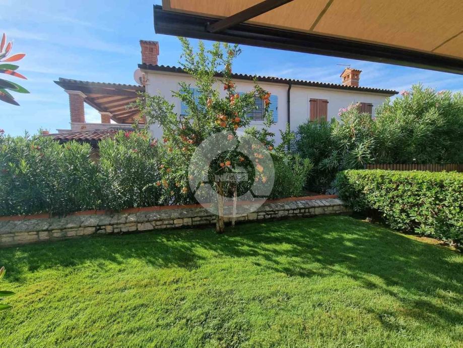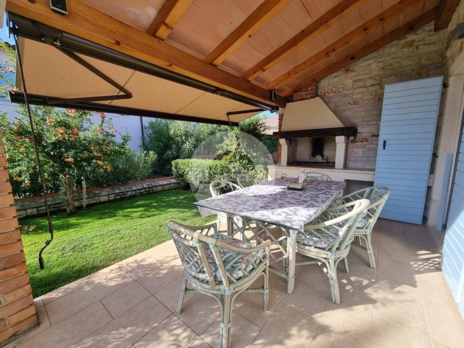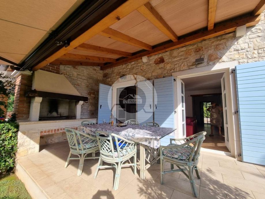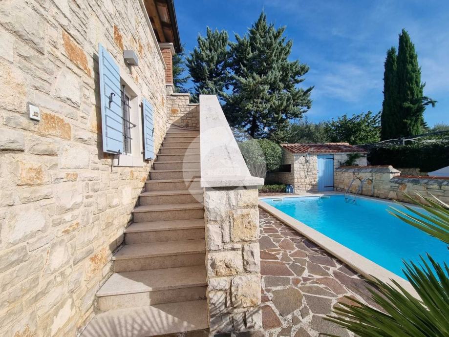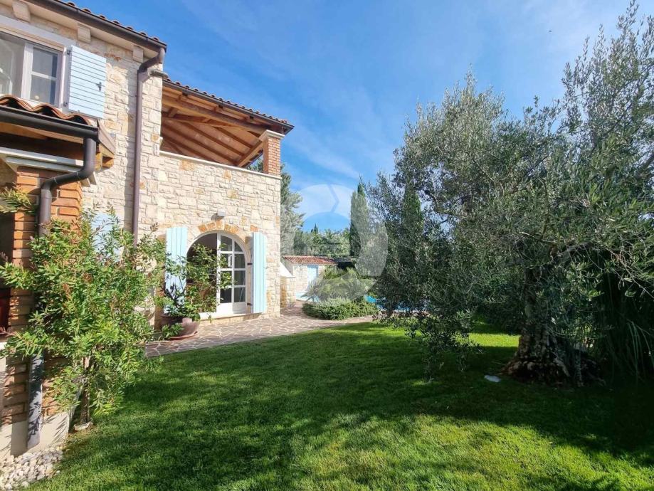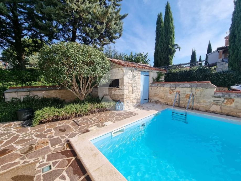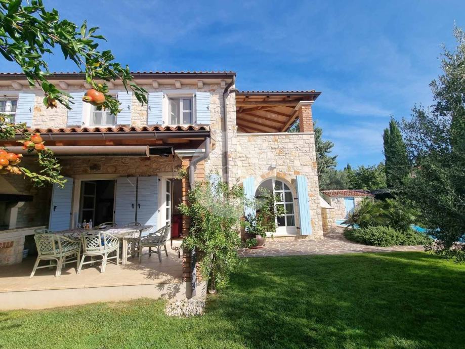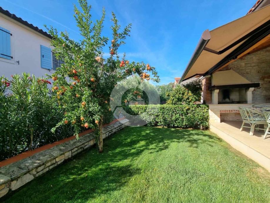 Prekrasna dvojna kuća nalazi se na mirnoj lokaciji nedaleko od Poreča i svega 1 km od mora. Sagrađena je 2006. godine, a vlasnici su je renovirali 2021. godine, te ju kontinuirano održavaju. Kupili su je i koristili isključivo za svoje potrebe, kuća nije nikada iznajmljivana! Ukupno ima 155,55 m2 sa terasama (135 m2 zatvorenog prostora), na parceli od 367 m2. Vrta ima 200 m2. Kuća se sastoji od prizemlja i kata, mediteransko-rustikalnog je stila. U prizemlju se nalaze hodnik, spavaća soba, kupaona, veliki dnevni boravak sa kaminom i kuhinja sa blagovanom. Iz dnevnog boravka i kuhinje izlazi se na natrkivenu terasu gdje se nalazi još jedan kamin i stol za ručavanje, te u vrt. Na katu se nalaze još dvije spavaće sobe svaka sa svojim kupatilom, koje dijele prostranu natkrivenu terasu. Terasa je vanjskim stubištem povezana sa vrtom. Vrt je prekrasno uređen sa mediteranskim biljkama, starom maslinom, uređenim travnjakom, te bazenom od 30 m2. Uz bazen je napravljena mala kamena vrtna kućica od 7 m2 gdje je predviđeno sve za saunu ili može služiti kao spremište. Uz bazen i kućicu se nalazi vanjski tuš. Kuća ima 2 parkirna mjesta. Cijeli vrt je zatvoren zidom, zelenilom ili metalnom ogradom. U stražnjem dijelu kuće, blizu bazena, nalazi se spremište/kotlovnica i ljetna kuhinja. Kuća se prodaje sa namještajem koji je izrađen za cijelu kuću po mjeri. Grijanje je regulirano centralno na lož ulje. Pokretna klima je instalirana samo u jednoj spavaćoj sobi. Instaliran je i alarm te video kamere. Kuća može biti odmah useljiva!