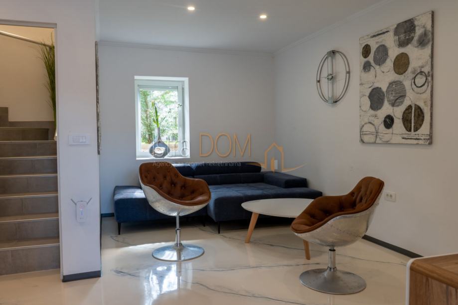 Površina kuće je 150m2 i okučnica 60m2 na kojoj je smješten bazen od 18m2.