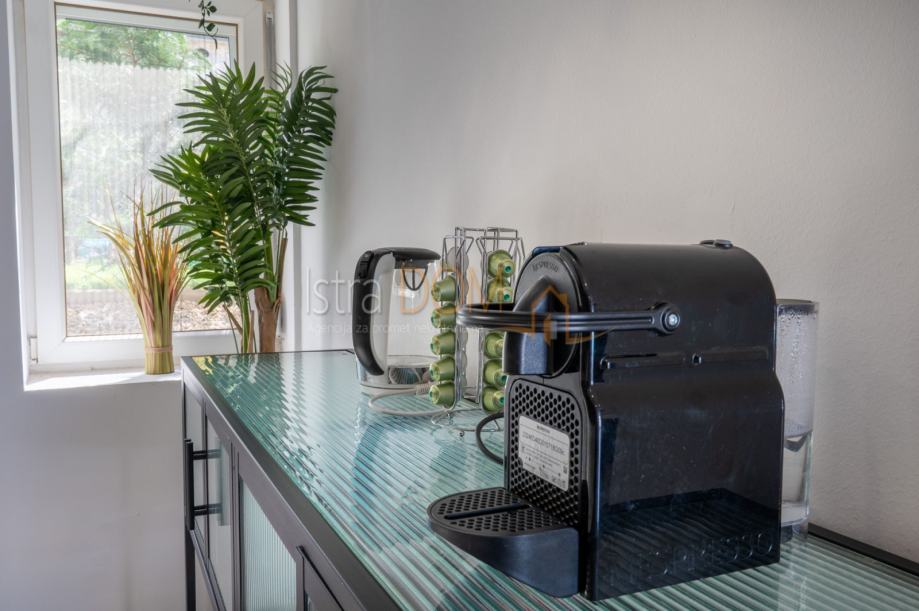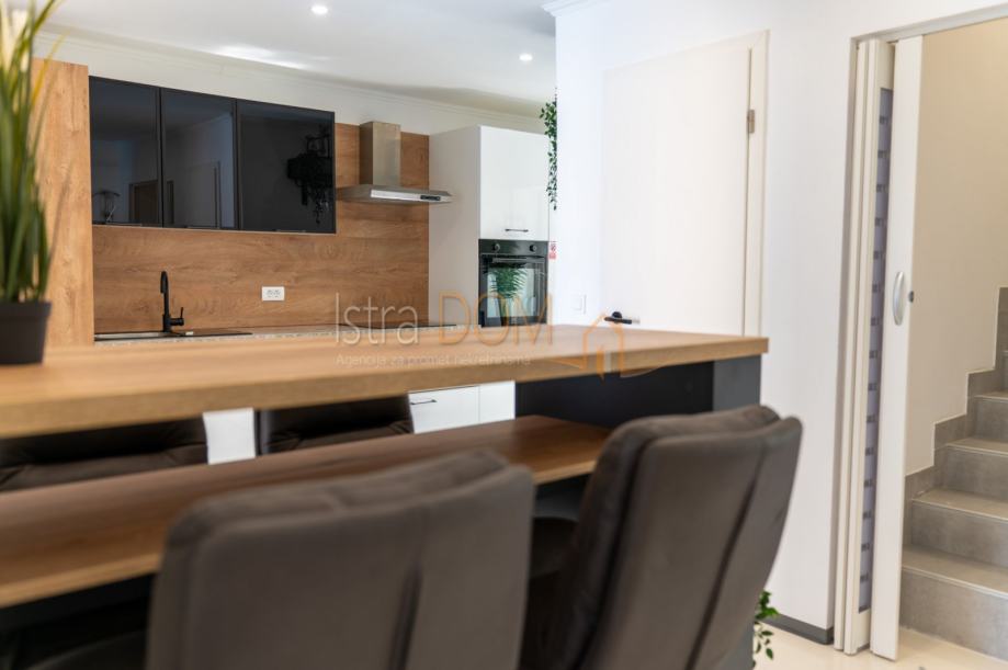 U prizemlju se nalazi dnevni boravak s kuhinjom i blagovaonicom , kupaonica, vešeraj i izlaz na terasu i bazen.