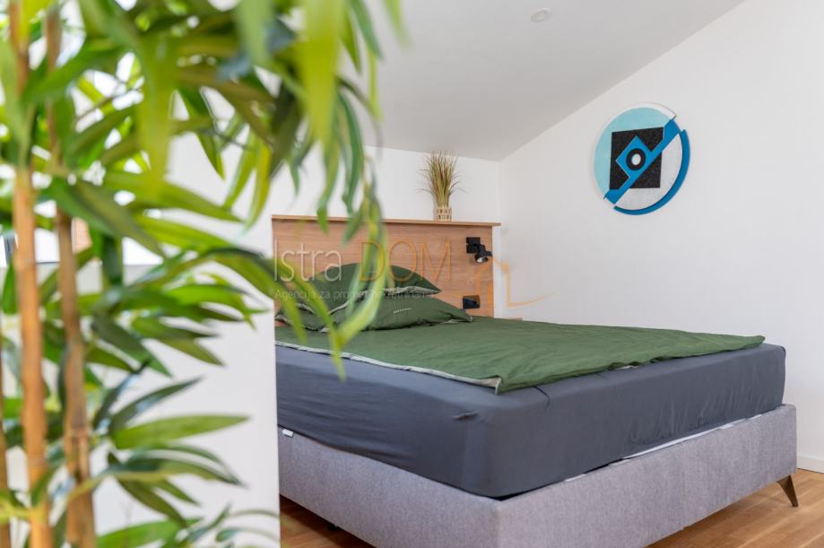 Na katu se nalaze dvije spavaće sobe s izlazom na veliki balkon s pogledom na bazen, kupaonica