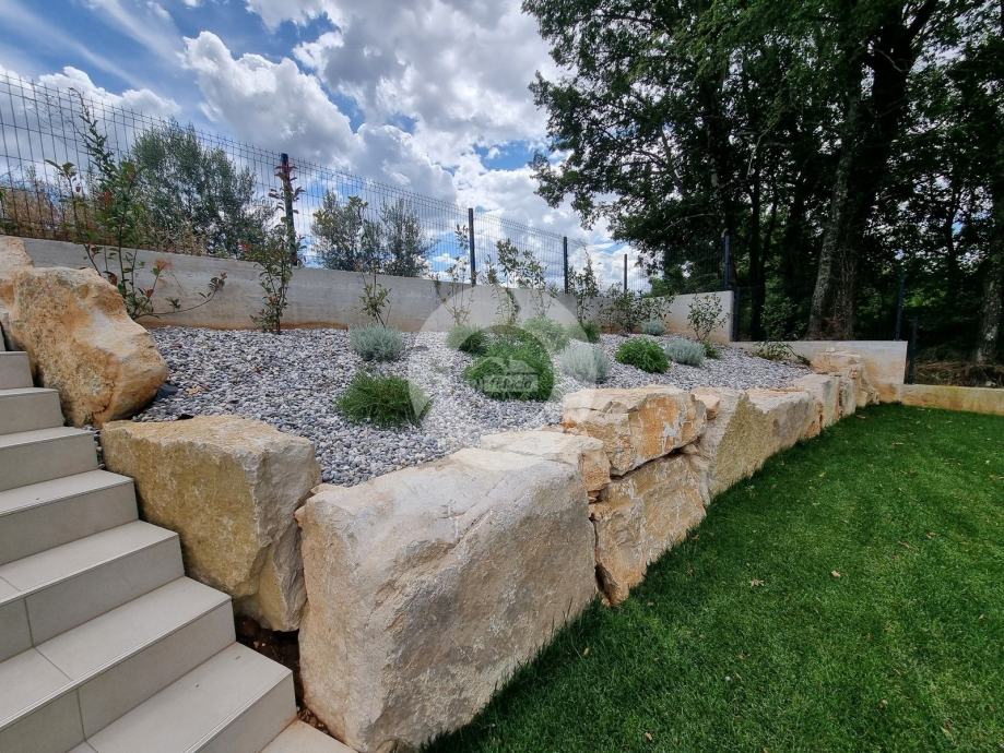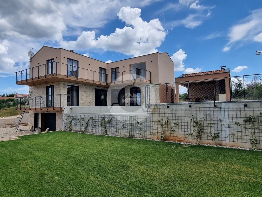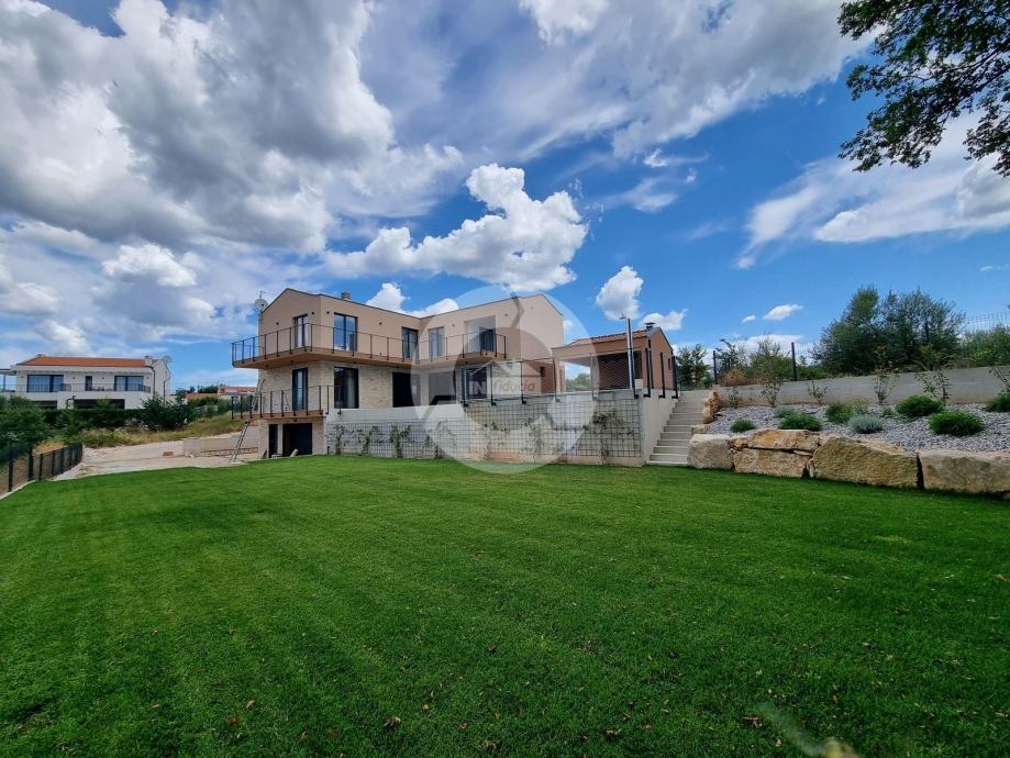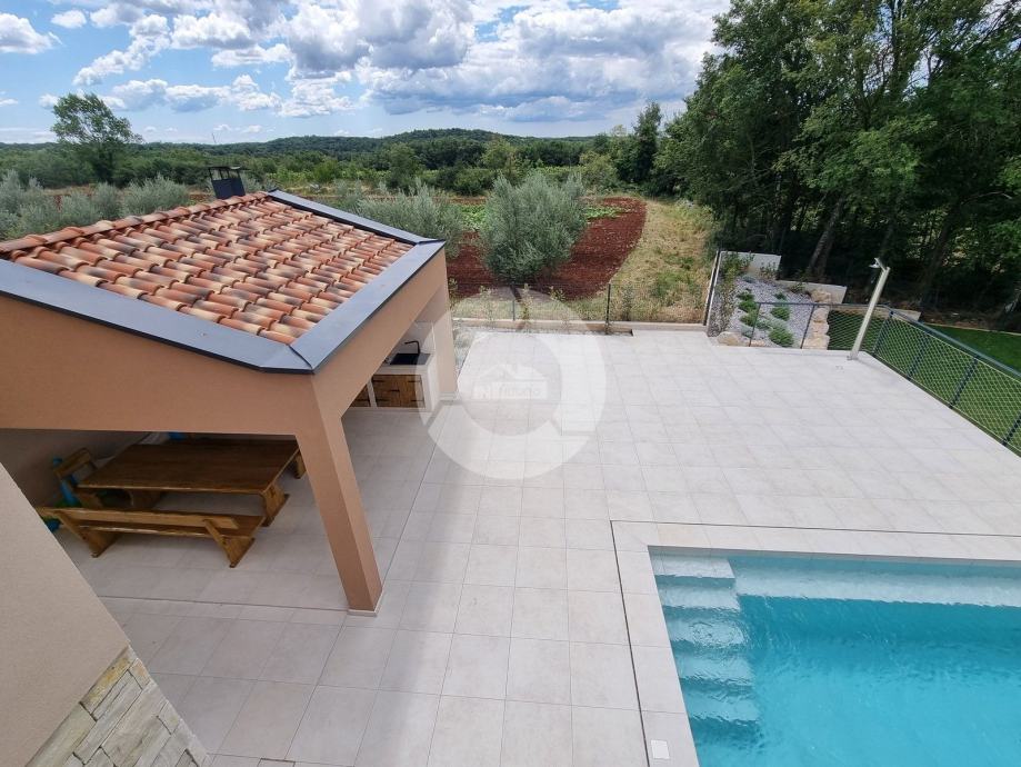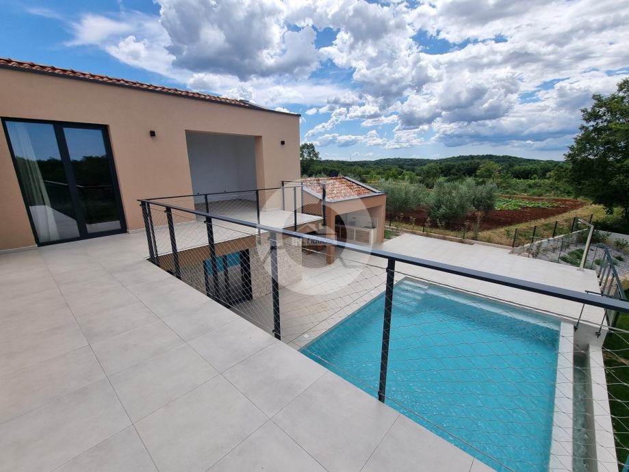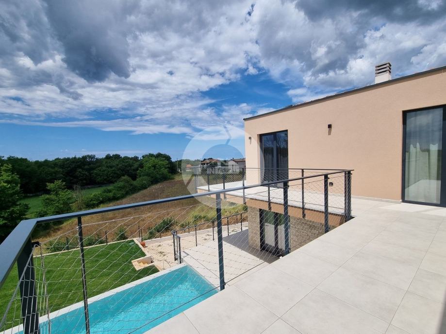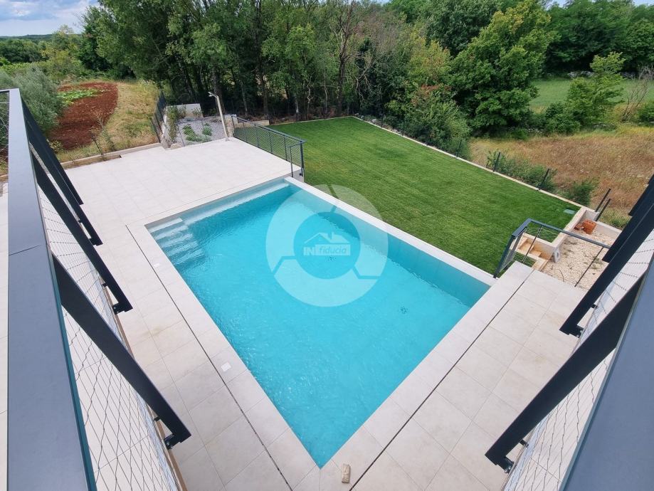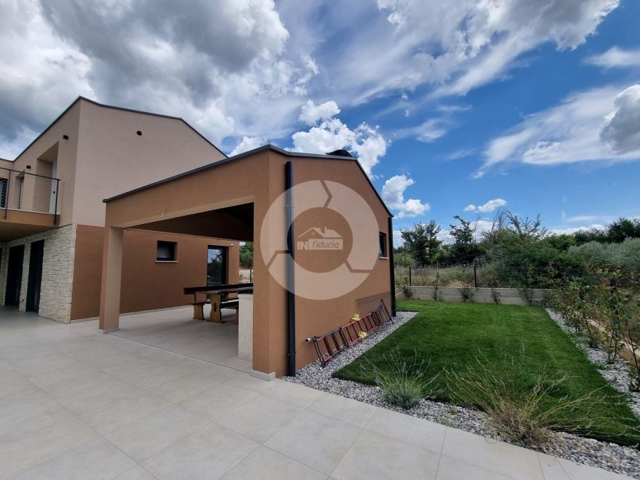 Ova lijepa vila u novogradnji, smjestila se na rubu istarskog sela nedaleko od Višnjana (7 km). Lokacija je vrlo mirna i okružena je prirodom, što garantira maksimalnu privatnost. Planirani dovršetak kuće do useljenja je ljeto 2025. godine. Sastoji se od tri etaže: polu suteren, prizemlje i prvi kat. U polu suterenu se nalazi garaža, strojarnica bazena, tehnička soba, wc i jedan prostor koji je predviđen za biljar, prostor za druženje no može se prenamijeniti i u wellness prostor za saunu ili fitness. Unutarnjim stepenicama se odlazi u prizemlje. U prizemlju se nalazi ulazni hodnik, dnevni boravak, blagovaona, kuhinja, spavaće soba sa vlastitom kupaonom, te wc za goste. Iz svih prostrorija se može izaći na prostranu terasu od 34,03 m2 i vrt. Na katu se nalaze još tri spavaće sobe sa vlastitim kupaonama. Jedna soba ima i loggiju u koju se može smjestiti jacuzzi za dvije osobe, a sve sobe imaju izlazak i na prostrani balkon od 31,86 m2. u vrtu se nalaze parkirna mjesta, ljetna kuhinja od 23,36 m2 sa wc-om, te bazen od 40 m2. Lokacija je idealna za one koji žele biti dalje od gradskih gužvi i buke, a opet u blizini sadražaja mjesta (7 km).