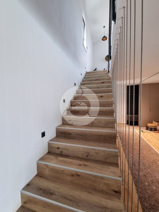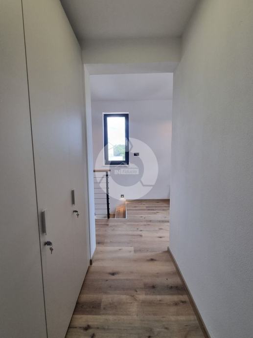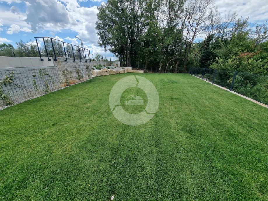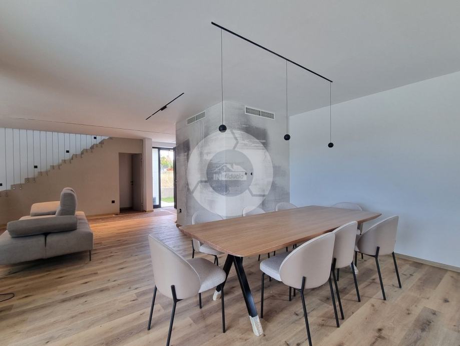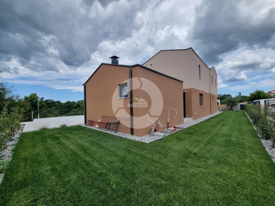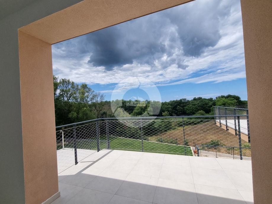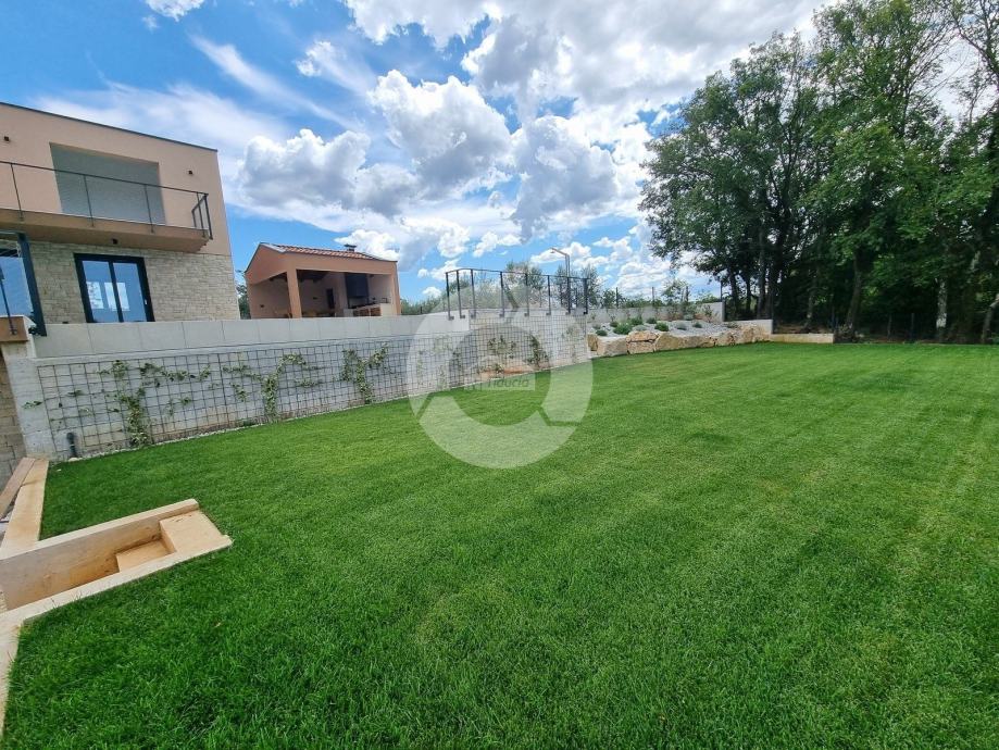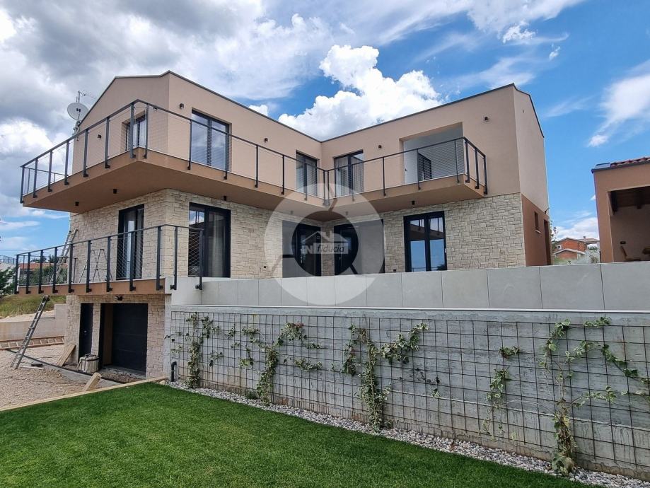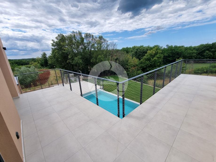 Ova lijepa vila u novogradnji, smjestila se na rubu istarskog sela nedaleko od Višnjana (7 km). Lokacija je vrlo mirna i okružena je prirodom, što garantira maksimalnu privatnost. Planirani dovršetak kuće do useljenja je ljeto 2025. godine. Sastoji se od tri etaže: polu suteren, prizemlje i prvi kat. U polu suterenu se nalazi garaža, strojarnica bazena, tehnička soba, wc i jedan prostor koji je predviđen za biljar, prostor za druženje no može se prenamijeniti i u wellness prostor za saunu ili fitness. Unutarnjim stepenicama se odlazi u prizemlje. U prizemlju se nalazi ulazni hodnik, dnevni boravak, blagovaona, kuhinja, spavaće soba sa vlastitom kupaonom, te wc za goste. Iz svih prostrorija se može izaći na prostranu terasu od 34,03 m2 i vrt. Na katu se nalaze još tri spavaće sobe sa vlastitim kupaonama. Jedna soba ima i loggiju u koju se može smjestiti jacuzzi za dvije osobe, a sve sobe imaju izlazak i na prostrani balkon od 31,86 m2. u vrtu se nalaze parkirna mjesta, ljetna kuhinja od 23,36 m2 sa wc-om, te bazen od 40 m2. Lokacija je idealna za one koji žele biti dalje od gradskih gužvi i buke, a opet u blizini sadražaja mjesta (7 km).