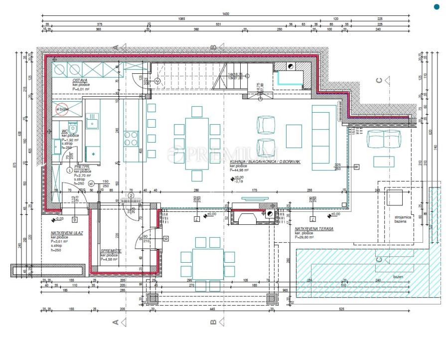 Prizemlje kuće sastoji se od ulaznog prostora, gostinjskog wc-a, ostave, kuhinje s blagovaonicom i dnevnog boravka, s izlazom na prostranu terasu (površine cca 15 m2) s koje se dolazi na sunčalište i bazen (površine cca 30 m2 i dubine 1,40m).