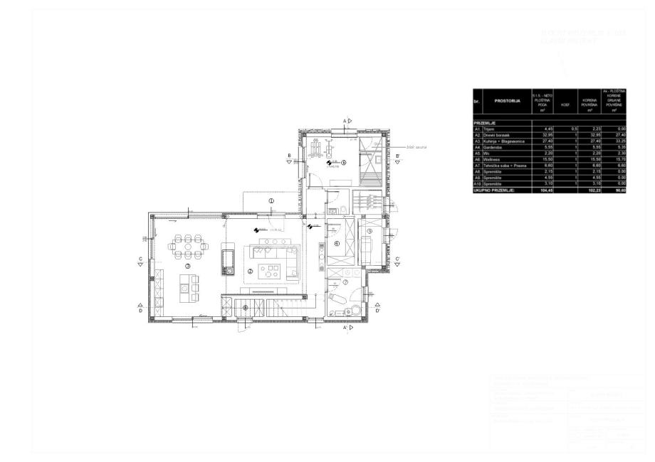 Kuća se sastoji od dvije etaže - prizemlja, gdje se nalaze dnevni prostori u otvorenom konceptu, sanitarije, garderoba te tehničke prostorije za sistem centralnog grijanja i praona rublja sa svim potrebnim priključcima te prostorije za skladištenje osobnih stvari, bicikla te mobilne opreme za okućnicu i bazen. Posebni dio prizemlja očarava s neizostavnim wellnes prostorom sa saunom i tušem.