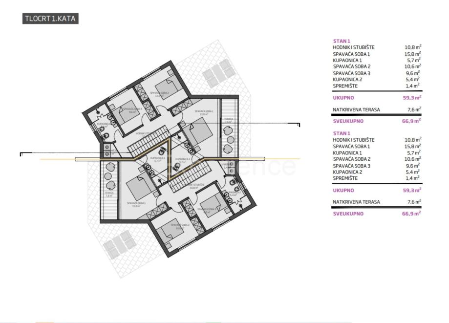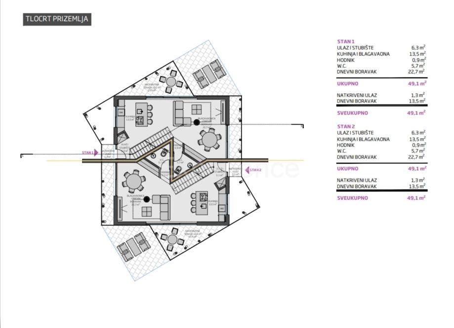 Raspored prostorija:• Prizemlje: prozračan open space prostor koji objedinjuje dnevni boravak, kuhinju i blago-vaonicu s direktnim izlazom na natkrivenu terasu i toalet,• Kat: tri udobne spavaće sobe, od kojih glavna spavaća soba ima vlastitu kupaonicu i izlaz na terasu. Dok dvije spavaće sobe dijele zajedničku kupaonicu, i spremište.