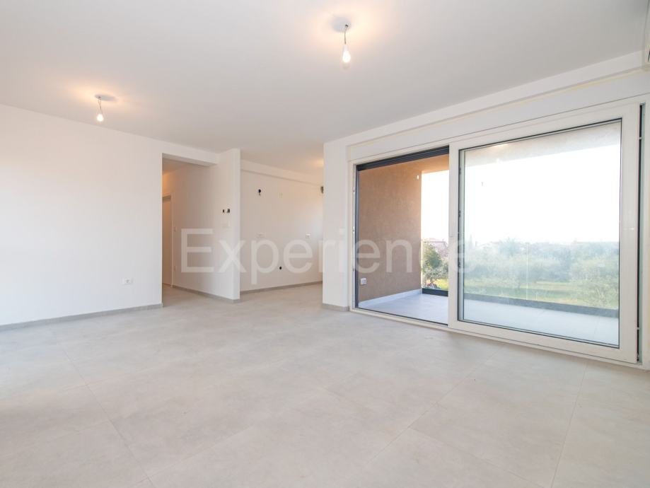 U okolici Poreča – cca. 1.800 m od mora, u iznimno mirnom ambijentu na prodaji je trosoban stan u novogradnji, površine 66,48 m². Stan se nalazi u prizemlju stambene zgrade. Sadrži: predsoblje, otvoreni i svijetao prostor u kojem su smješteni dnevni boravak, kuhinja i blagovaonica sa izlazom na prostranu natkrivenu terasu (8,42 m²), dvije spavaće sobe, kupaonicu i toalet. Zgrada je opremljena liftom.