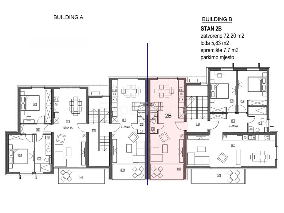 Na prodaji je dvoetažni stan smješten na prvom katu stambene zgrade, a koji se prostire na 72,20 m². Interijer stana obuhvaća dvije etaže. Na donjoj etaži nalazi se otvoren i svijetao prostor u kojem su smješteni dnevni boravak, blagovaonica i kuhinja sa izlazom na lođu i toalet. Dok su na gornjoj etaži smještene dvije spavaće sobe i kupaonica. Sa lođe pruža se otvoreni pogled na more. Stanu također pripada spremište u prizemlju zgrade (7,70 m²) i natkriveni parking.