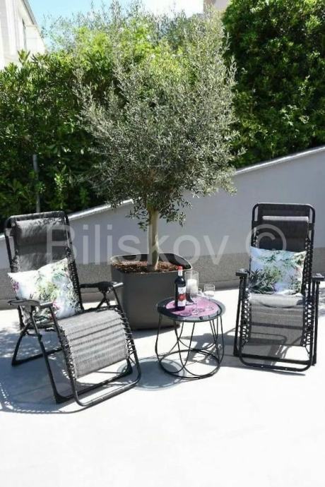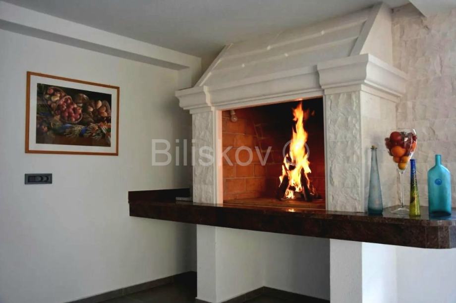 Okućnica je hortikulturno uređena u mediteranskom stilu, s vanjskim tušem, sunčalištem i velikim kamenim kaminom sa stolom za druženja na otvorenom.