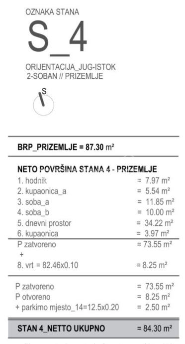 Stan S4 nalazi se u prizemlju i ima neto obračunsku površinu 84,30 m². Sastoji se od: hodnik = 7.97 m², kupaonica_1 = 5.54 m², soba_1 = 11.85 m², soba_2 = 10.00 m², dnevni prostor = 34.22 m², kupaonica = 3.97 m², vrt= 82.46x0.10 = 8.25 m², parkirno mjesto_14=12.5x0.20 = 2.50 m²