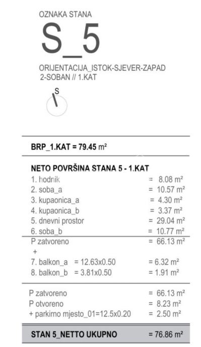 Stan S5 nalazi se na 1. katu i ima neto obračunsku površinu 76,86 m². Sastoji se od: hodnik = 8.08 m², soba_1 = 10.57 m², kupaonica_1 = 4.30 m², kupaonica_2 = 3.37 m², dnevni prostor = 29.04 m², soba_2 = 10.77 m2, balkon_1 = 12.63x0.50 = 6.32 m², balkon_2 = 3.81x0.50 = 1.91m2, parkirno mjesto_01=12.5x0.20 = 2.50 m²