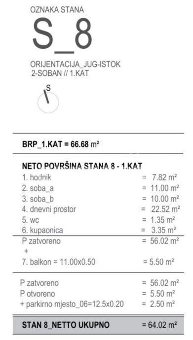 Stan S8 nalazi se na 1. katu i ima neto obračunsku površinu 64,02 m². Sastoji se od: hodnik = 7.82 m², soba_1 = 11.00 m², soba_2 = 10.00 m², dnevni prostor = 22.52 m², wc = 1.35 m², kupaonica = 3.35 m², balkon = 11.00x0.50 = 5.50 m², parkirno mjesto_06=12.5x0.20 = 2.50 m²
