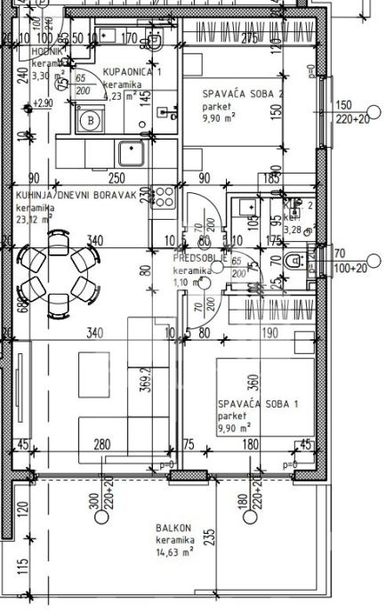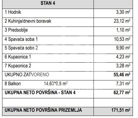Stan se prostire na ukupno 70 kvadratnih metara, od čega zatvoreni dio čini 55 kvadratnih metara, dok balkon zauzima dodatnih 15 kvadratnih metara. Prostor je pažljivo osmišljen kako bi pružio maksimalnu udobnost i funkcionalnost.