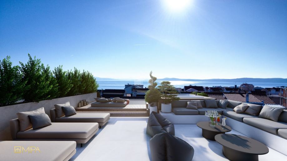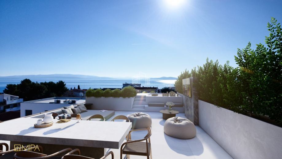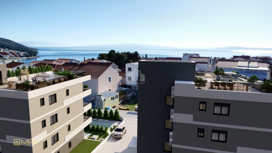 Ulaz vodi u hodnik koji vodi do dnevnog prostora i s čije je desne strane smještena kupaonica. Prostrana kuhinja, blagovaonica i dnevni boravak čine otvoreni prostor koji je idealan za druženje i opuštanje. Iz dnevnog boravka se izlazi na prostrani balkon s kojeg se pruža predivan pogled na more. Predsoblje vodi do dvije spavaće sobe, od kojih jedna ima izlaz na drugi balkon te kupaonicu, pružajući dodatnu privatnost i komfor.