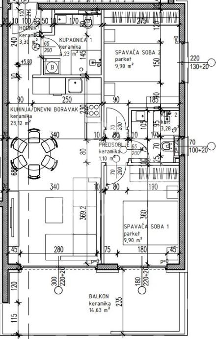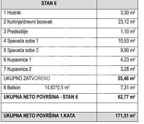 Stan se prostire na ukupno 70 kvadratnih metara, od čega zatvoreni dio čini 55 kvadratnih metara, dok balkon zauzima dodatnih 15 kvadratnih metara. Prostor je pažljivo osmišljen kako bi pružio maksimalnu udobnost i funkcionalnost.