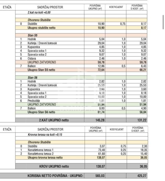 Unutarnja površina stana iznosi 51,94 m2, balkona 9,80 m2, a krovne terase 61 m2.