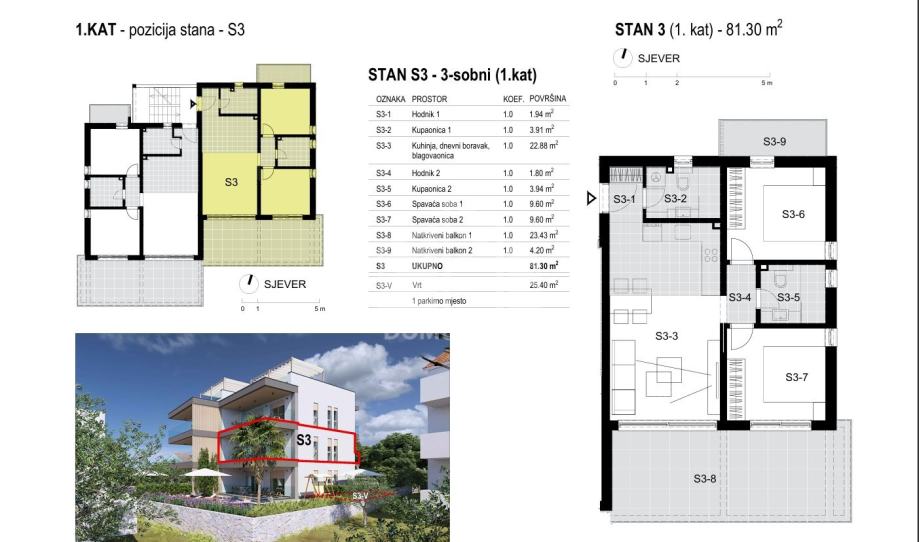 Prodaje se moderan trosoban stan na prvom katu novogradnje, ukupne površine 81,30 m², koji se ističe funkcionalnim rasporedom, dvjema natkrivenim balkonima i dodatnim vrtom u prizemlju zgrade. Ova nekretnina predstavlja odličan spoj komfora, privatnosti i vanjskog prostora, idealan za obiteljskiživot ili kvalitetnu investiciju.