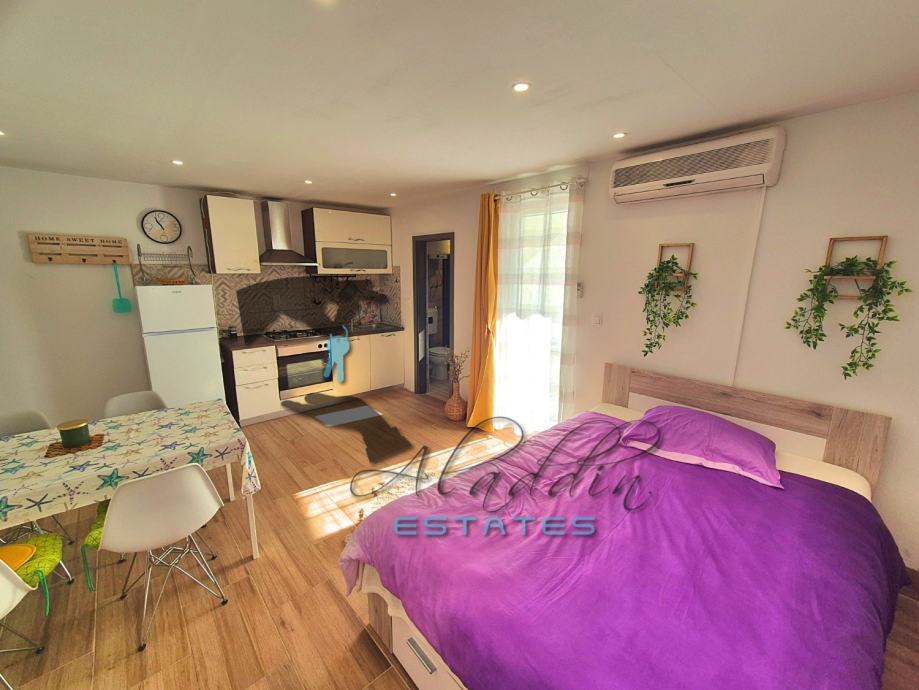 Studio apartment on the second floor of a residential building in Okrug Gornji. It is in good condition, renovated in 2021, fully equipped and furnished. It has a spacious living room, kitchen and bedroom combined into one unit of 21.64 m2, and a covered balcony of 5.34 m2, for the total of 24.31 m2 of net usable space with coefficients. It has an air conditioning unit, oven, electric and gas stoves, hood, refrigerator with freezer, washing machine and water heater, and everything is functional.