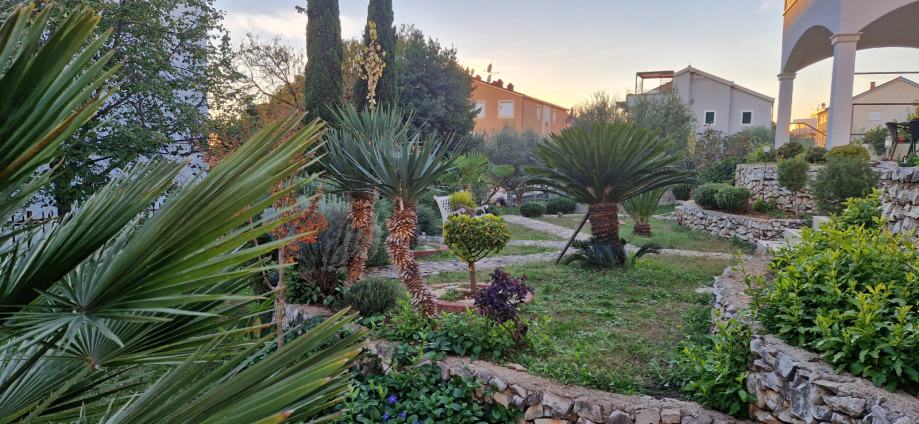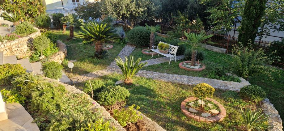 - južna strana: dizajnerski uređeni vrt s kamenim stazama, klupama i bogatom vegetacijom