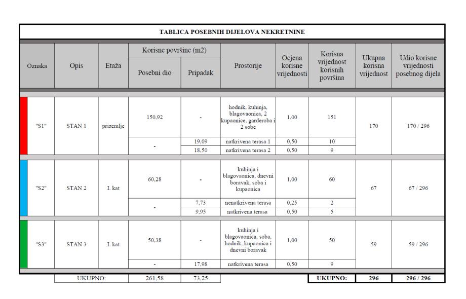 - stan "S3" (50,38 m²): kuhinja, blagovaonica, dnevni boravak, soba, hodnik, kupaonica i velika natkrivena terasa (17,98 m²)