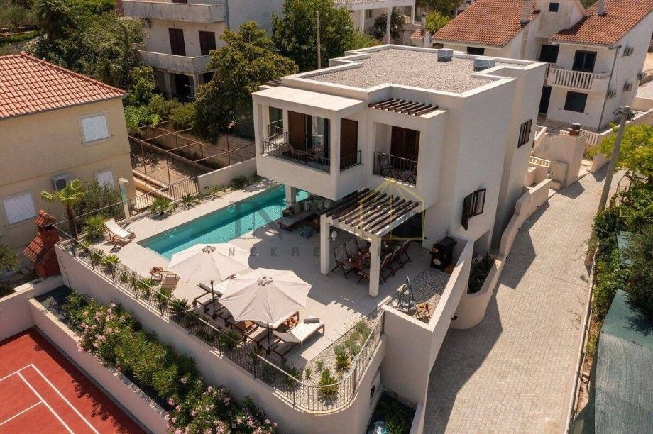 Prodajemo modernu samostojeću vilu s bazenom, smještenu na atraktivnoj lokaciji u Okrugu Gornjem na otoku Čiovu, Splitsko-dalmatinska županija, samo 30 metara od prekrasne šljunčane uvale.