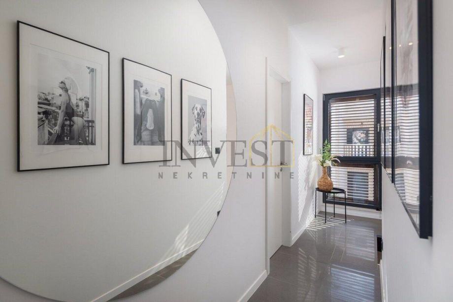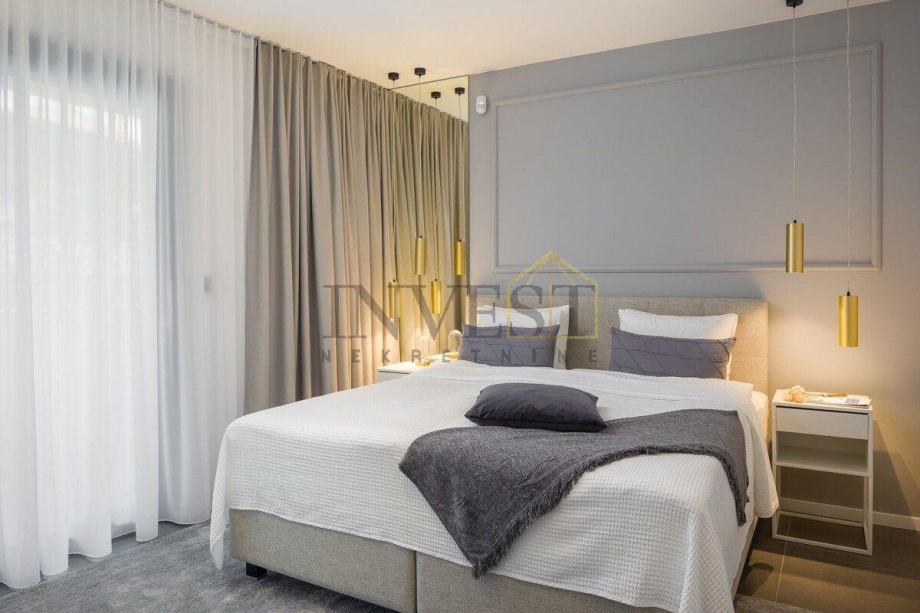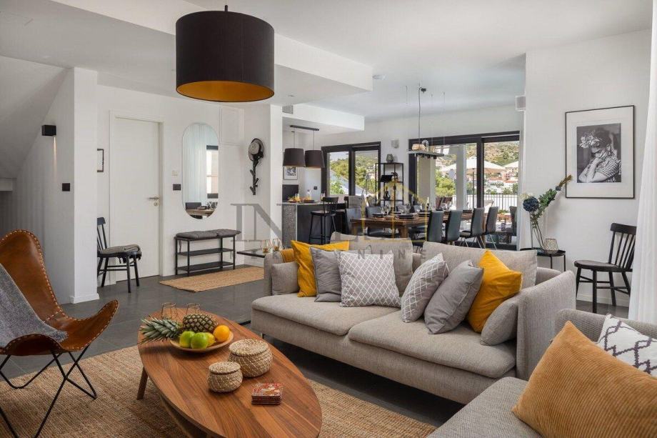 U prizemlju se nalazi prostrana spavaća soba s kupaonicom, garaža s dva parkirna mjesta, strojarnica za bazen te zajednički prostor za druženje. Prvi kat obuhvaća veliki dnevni boravak s modernom kuhinjom i blagovaonicom, s izlazom na prostranu terasu s grijanim bazenom i natkrivenim prostorom za druženje. Na drugom katu smještene su tri spavaće sobe, svaka s ugradbenim ormarima i vlastitom kupaonicom, te balkon s otvorenim pogledom na more.