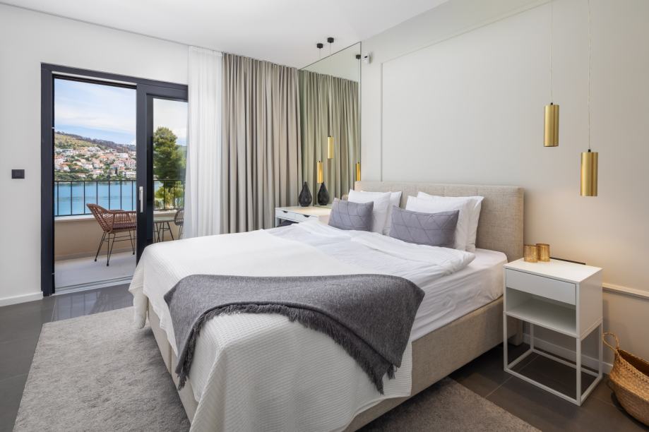Drugi kat: tri elegantne spavaće sobe, svaka s vlastitom kupaonicom i ugradbenim ormarima, te balkon s otvorenim pogledom na more.