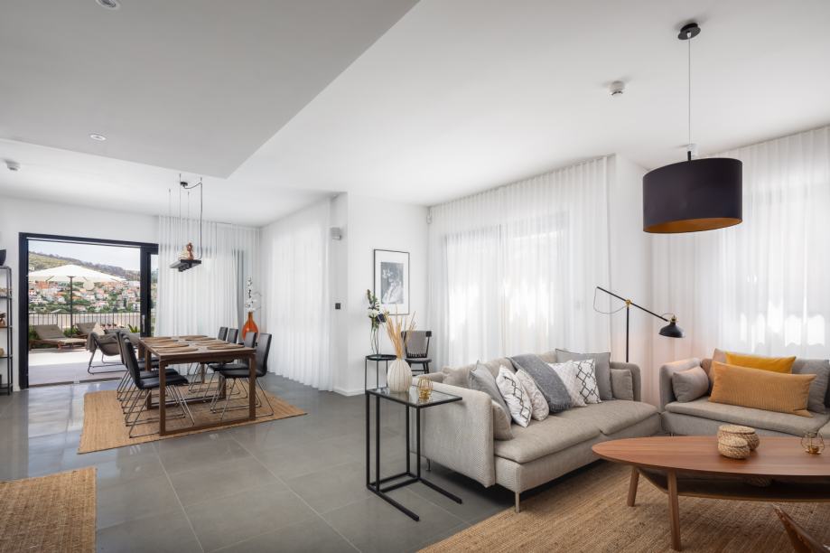 First floor: airy living room with modern kitchen and dining area, exit to a large terrace, covered outdoor living area, heated pool and sundeck.