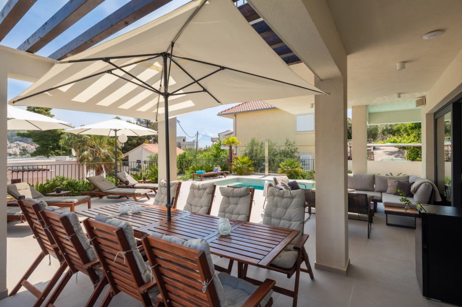 Prvi kat: prozračan dnevni boravak s modernom kuhinjom i blagovaonicom, izlaz na veliku terasu, natkriveni vanjski dnevni boravak, grijani bazen i sunčalište.
