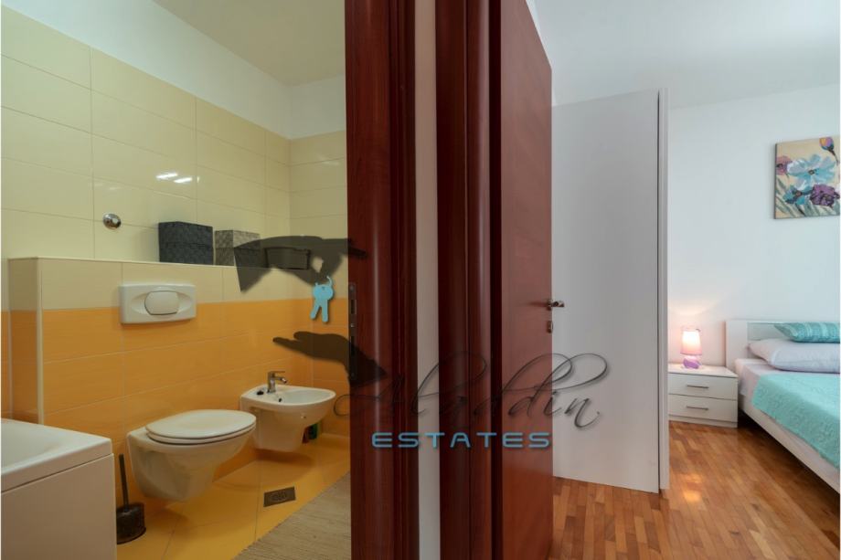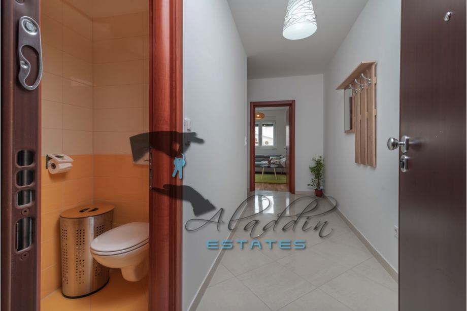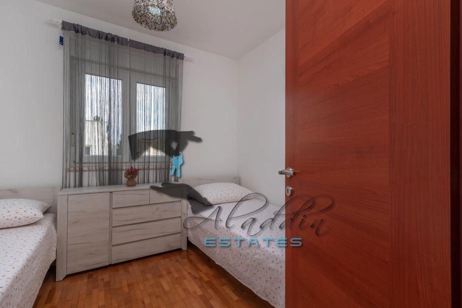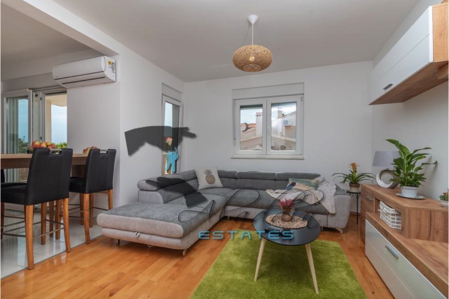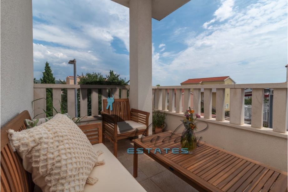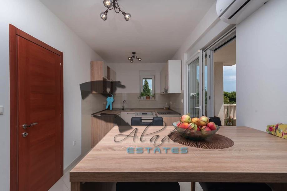 An extremely attractive apartment on the first floor of a four-storey residential building in Okrug Gornji. It is located on the southern side of the island, it is of recent construction and extremely well preserved, practically like new, and it also features nice sea view. It consists of a large living room combined with dining room and kitchen, two bedrooms, pantry, bathroom, toilet, hallway, basement storage and luxurious balcony. It contains 69.49 m2 of interior living space and 80.29 m2 together with balcony. It is fully furnished and equipped, including powerful air conditioning unit, TV, wireless internet, hydro-massage bathtub, balcony furniture set and anti burglary/fire doors. First-class natural parquet has been installed in the bedrooms and living room. The apartment as well as the entire building is of excellent construction and quality, everything is in immaculate condition without the slightest defects. The surroundings are very quiet, the neighbourhood is excellent and at the same time everything is very close, starting from the sea and the beach to all the additional amenities, and finally Trogir and the airport are very close by. The apartment includes one parking space.