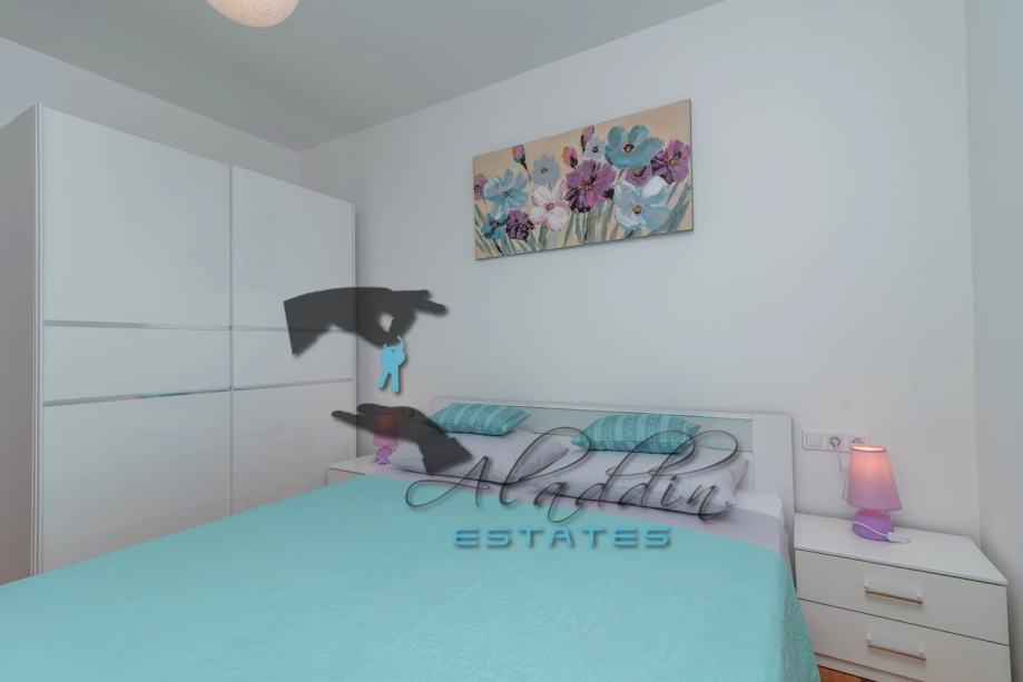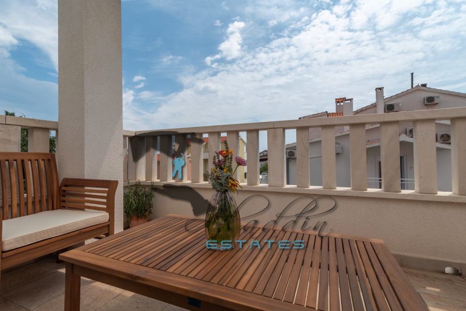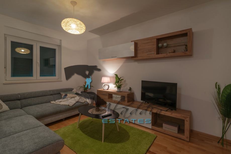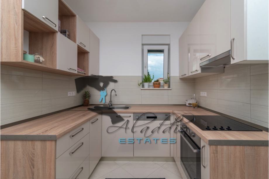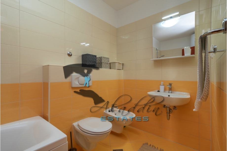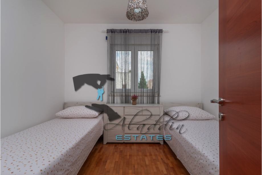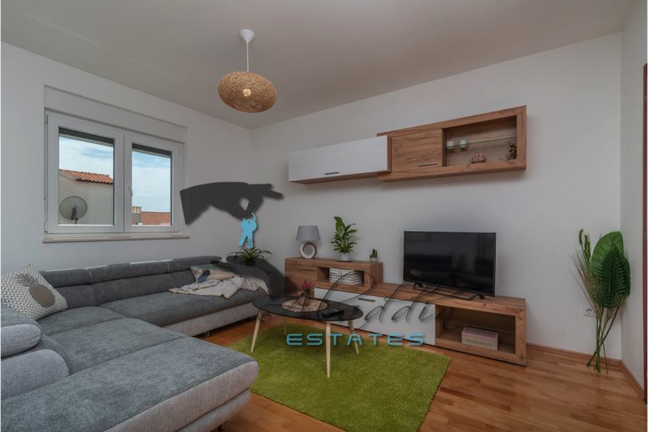 An extremely attractive apartment on the first floor of a four-storey residential building in Okrug Gornji. It is located on the southern side of the island, it is of recent construction and extremely well preserved, practically like new, and it also features nice sea view. It consists of a large living room combined with dining room and kitchen, two bedrooms, pantry, bathroom, toilet, hallway, basement storage and luxurious balcony. It contains 69.49 m2 of interior living space and 80.29 m2 together with balcony. It is fully furnished and equipped, including powerful air conditioning unit, TV, wireless internet, hydro-massage bathtub, balcony furniture set and anti burglary/fire doors. First-class natural parquet has been installed in the bedrooms and living room. The apartment as well as the entire building is of excellent construction and quality, everything is in immaculate condition without the slightest defects. The surroundings are very quiet, the neighbourhood is excellent and at the same time everything is very close, starting from the sea and the beach to all the additional amenities, and finally Trogir and the airport are very close by. The apartment includes one parking space.