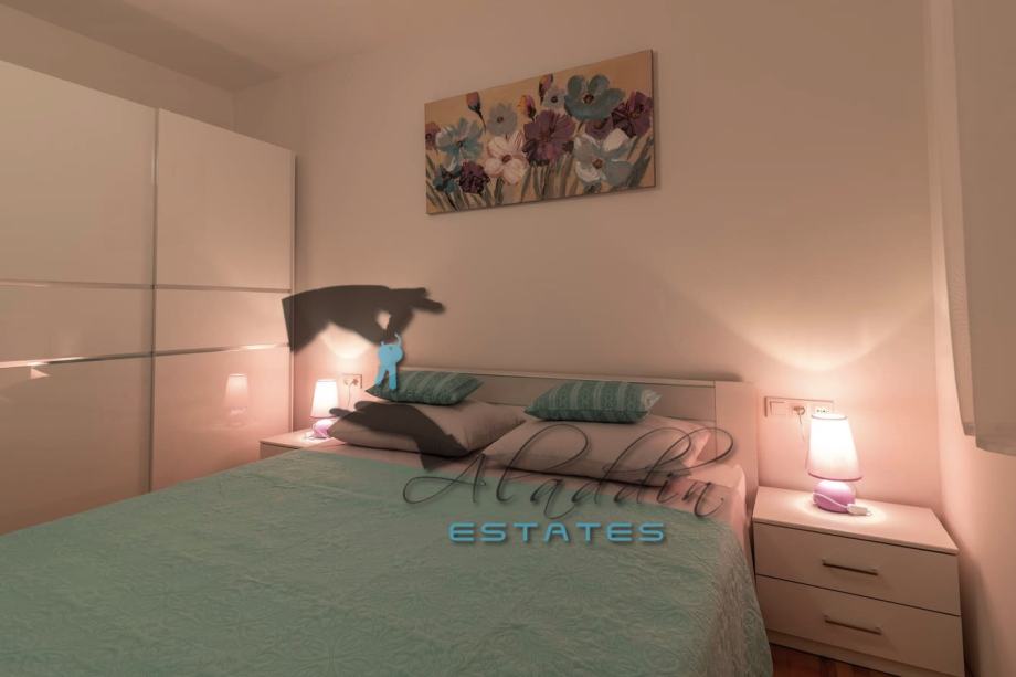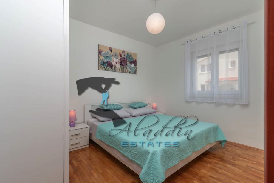 Izuzetno atraktivan stan na prvom katu stambene kuće četverokatnice u Okrugu Gornjem. Nalazi se na južnoj strani otoka, novije je gradnje i iznimno očuvan, praktički kao novi, a krasi ga i lijepi pogled na more. Čine ga veliki dnevni boravak kombiniran s blagovaonicom i kuhinjom, dvije spavaće sobe, kupaonicu, spremu, WC, hodnik, podrumsku ostavu te raskošni balkon. Sadrži 69.49 m2 unutarnjeg stambenog prostora odnosno 80.29 m2 skupa s balkonom. U potpunosti je namješten i opremljen, uključujući snažan klima uređaj, TV, bežični internet, hidromasažnu kadu, balkonsku garnituru i protuprovalna/protupožarna vrata. U spavaćim sobama i dnevnom boravku je postavljen prvoklasan prirodni parket. Stan kao i cijela zgrada je izvrsne izgradnje i kvalitete, sve je u odličnom stanju bez i najmanjih nedostataka. Okolica je vrlo mirna, susjedstvo izvrsno a istovremeno sve je vrlo blizu, počevši od mora i plaže, pa do svih dodatnih sadržaja, a na koncu i Trogir i aerodrom su nadohvat ruke. Stanu pripada i jedno parkirno mjesto.
