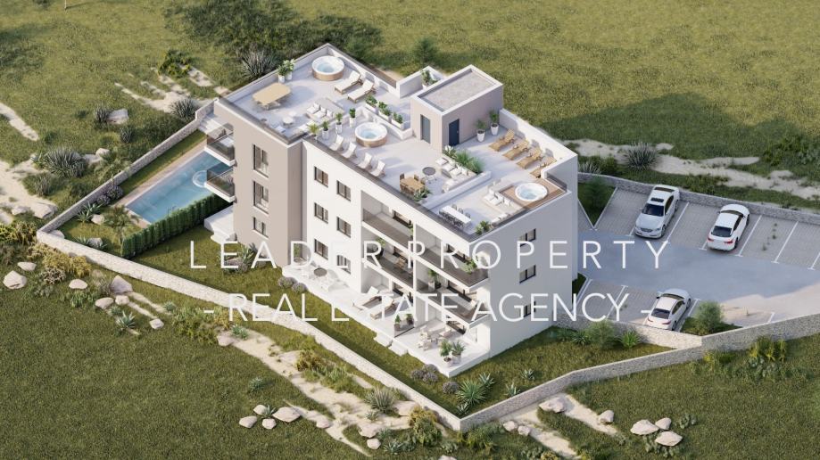 Okrug Gornji / STAN SA KROVNOM TERASOM I BAZENOM / POGLED NA MORE / (prodaja)