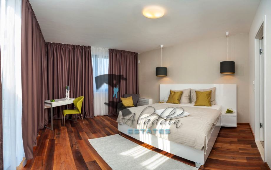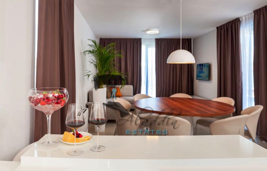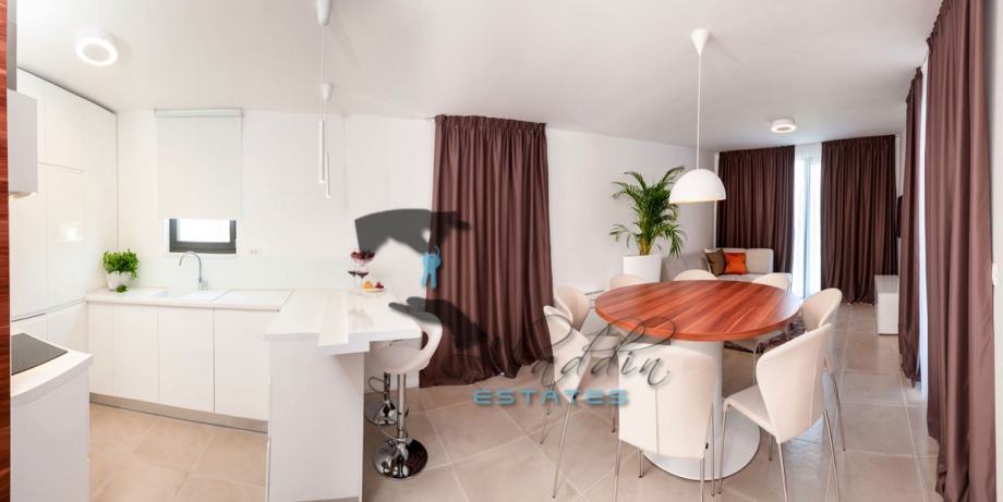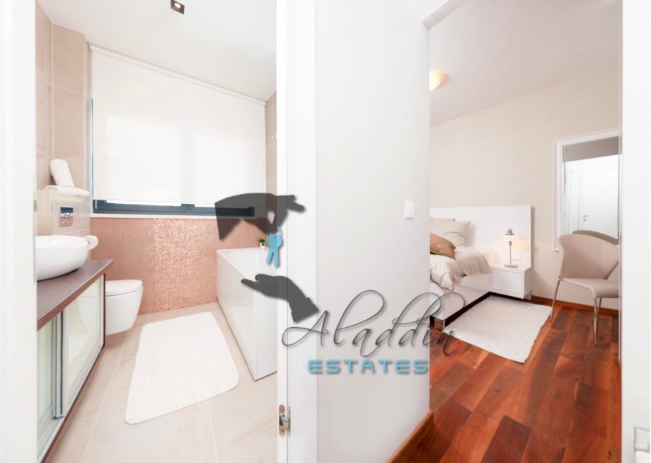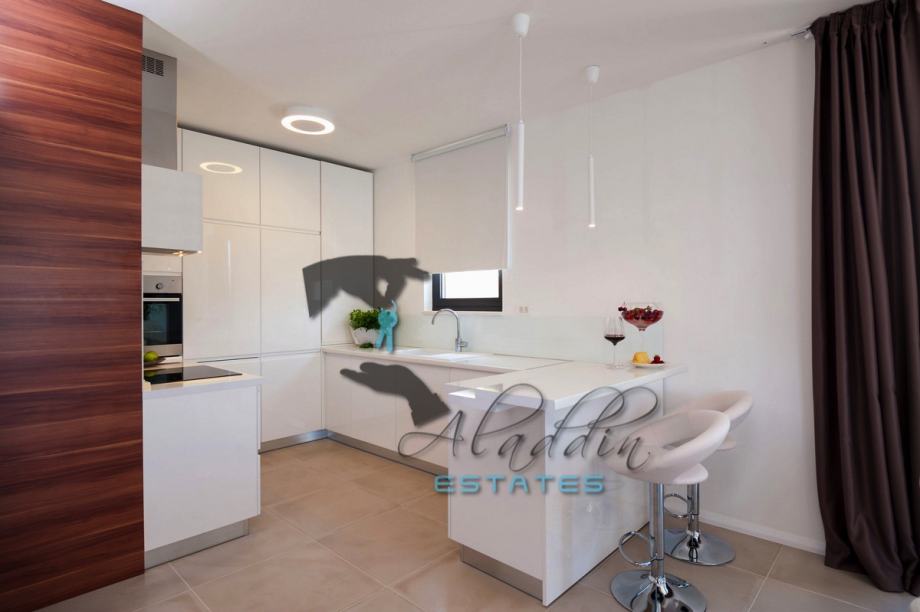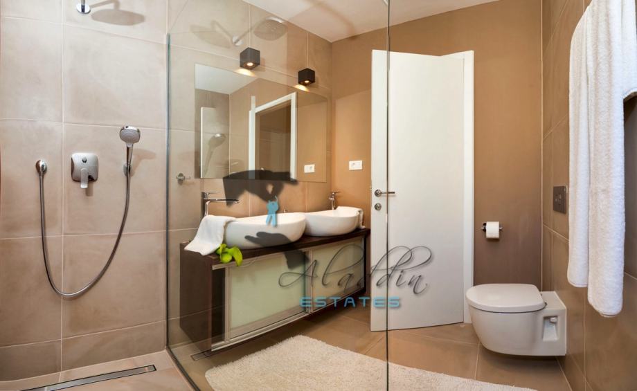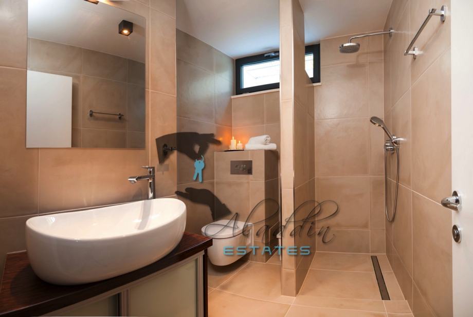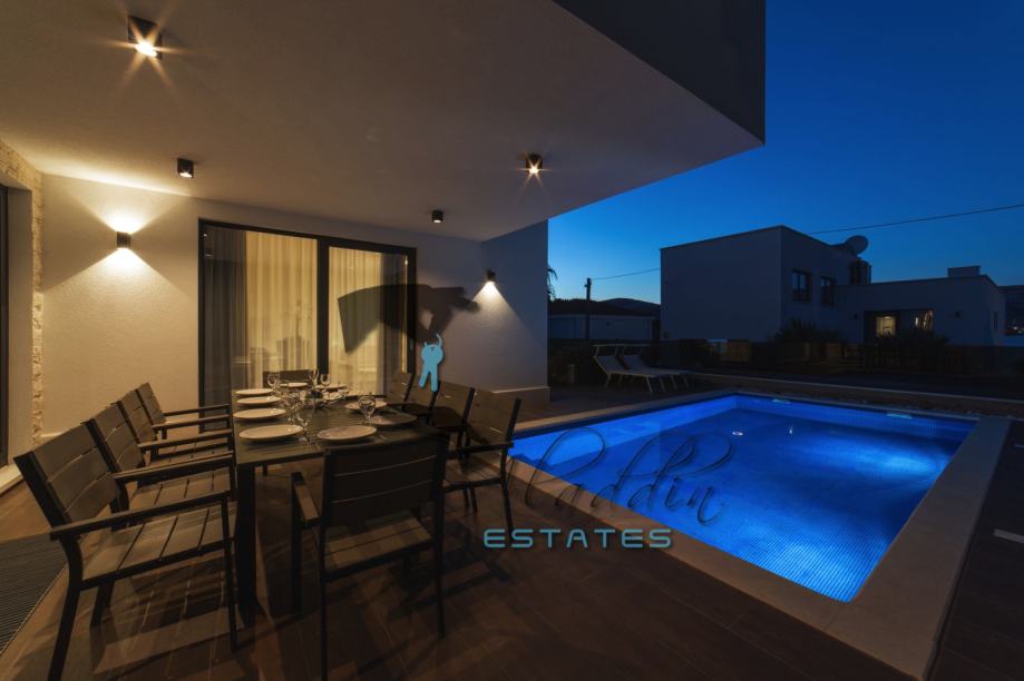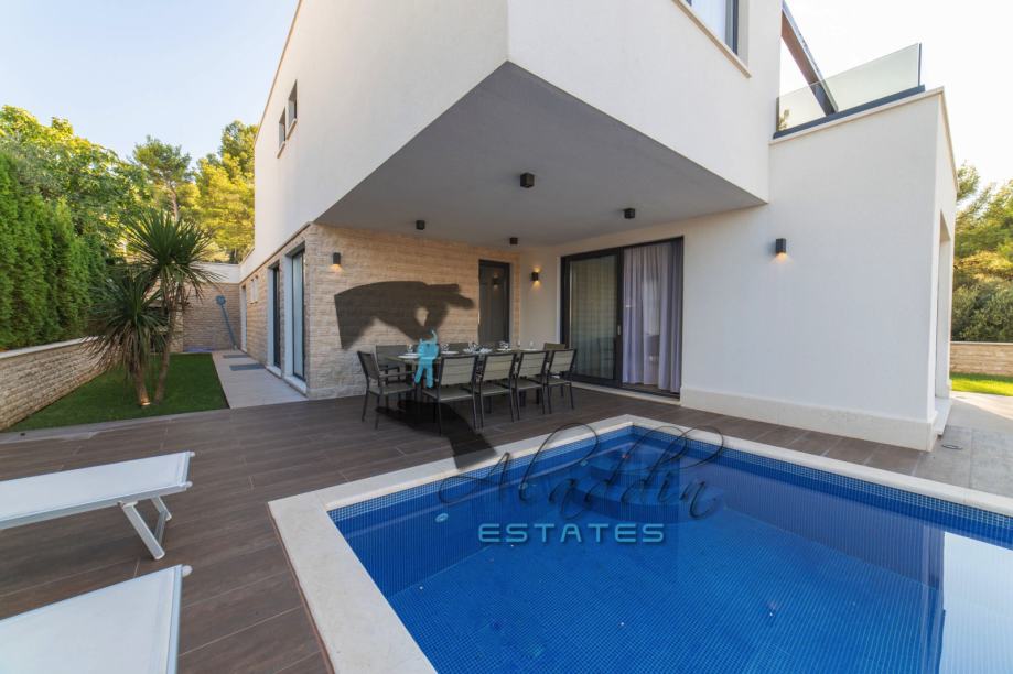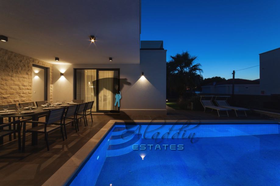 Super luksuzna i moderna vila od pet zvjezdica na četiri etaže u Okrugu Gornjem. Novogradnja, s 395 m2 stambenog prostora, vanjskim grijanim bazenom od 24 m2 i izuzetno uređenom okućnicom od 350 m². U podrumu se nalazi prostor za rekreaciju – fitness centar, sauna, tuš i WC, te unutarnji grijani bazen. Suteren čine prostrani dnevni boravak s kuhinjom, kupaonicom, dvije spavaće sobe svaka sa svojom kupaonicom, te vrlo elegantna terasa. Prizemlje se sastoji od tri spavaće sobe, opet svaka sa svojom kupaonicom, dvije dodatne terase kao i parkirnim mjestima. Na katu je još jedna spavaća soba sa svojom kupanicom te strojarnica.