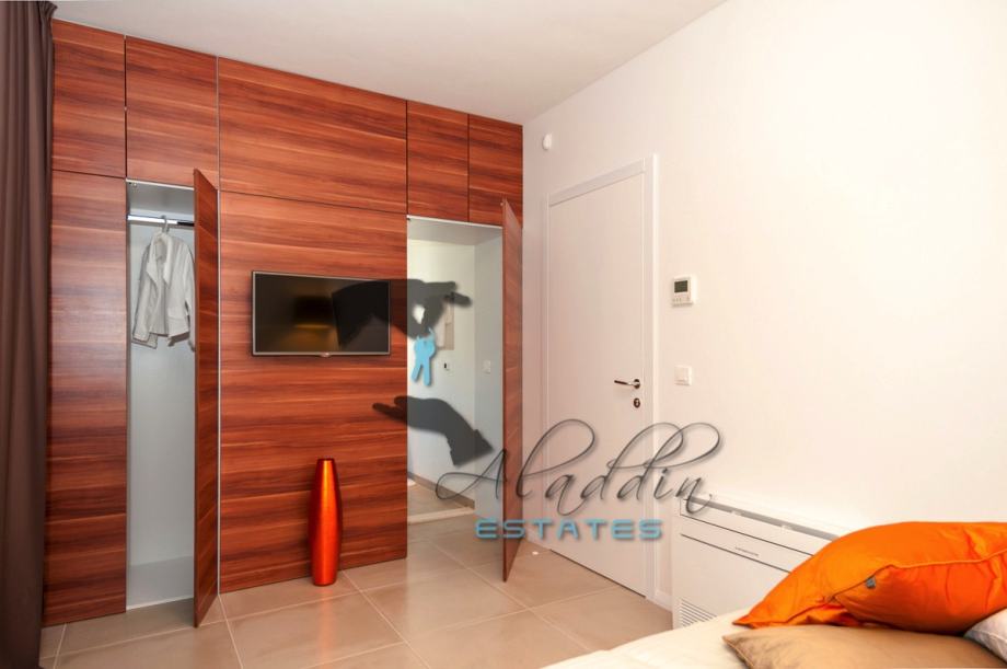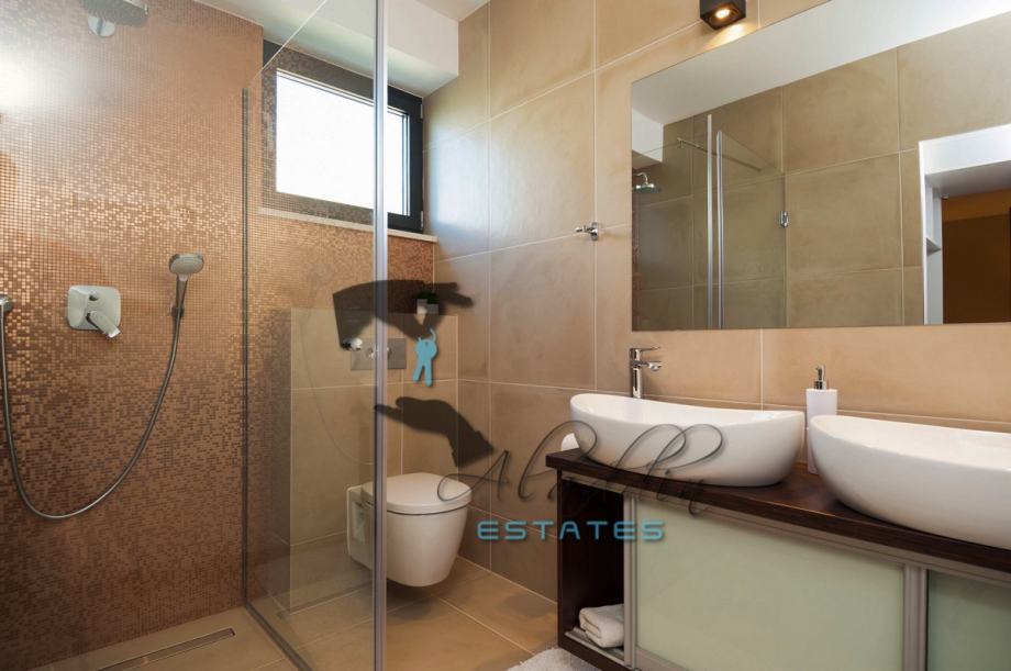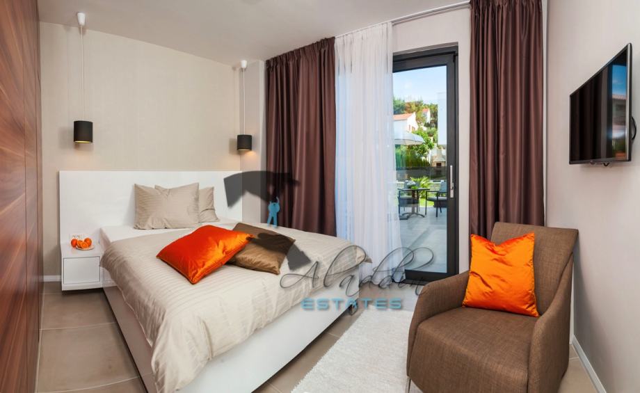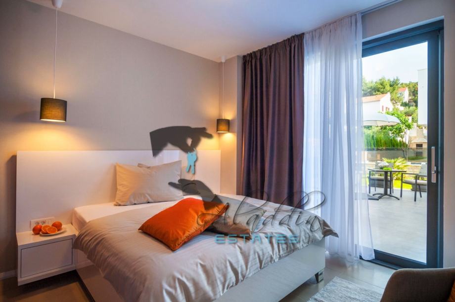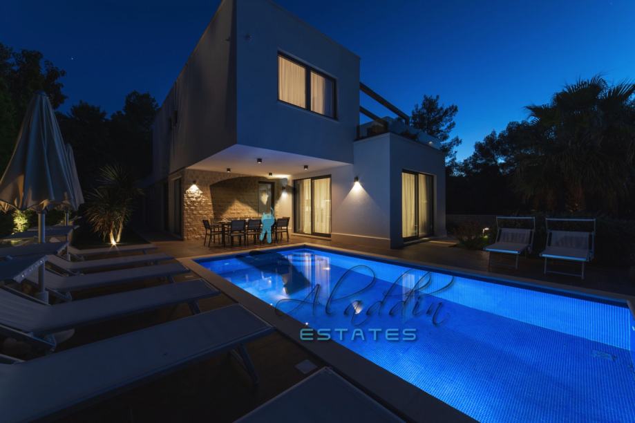 Super luxurious and modern five-star villa on four floors in Okrug Gornji. New construction, with 395 m2 of living space, outdoor heated pool of 24 m2 and a well-kept garden of 350 m2. In the basement is located a recreational area – fitness center, sauna, shower and toilet, and an indoor heated pool. The partially subterranean floor consists of a spacious living room with kitchen, bathroom, two bedrooms each with its own bathroom, and a very elegant terrace. The ground floor comprises three bedrooms, each with its own bathroom, two additional terraces and parking spaces. The first floor houses another bedroom with its own bathroom and boiler room.