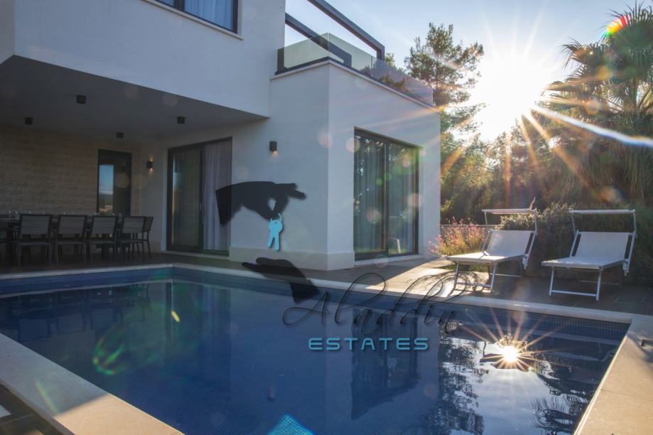 The property features a luxurious swimming pool with sun loungers and parasols, barbecue, very well-kept garden with a garden table and chairs and outdoor shower. The villa has numerous wall and floor air conditioning units, underfloor heating in bathrooms, solar panels, modern video surveillance and alarm system and is entirely designed on the basis of a smart-home model.