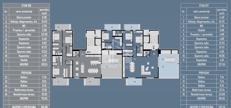 Unutarnja površina stana iznosi 137,55 m2, a vanjska 69,55 m2.