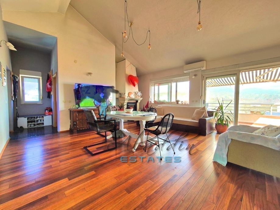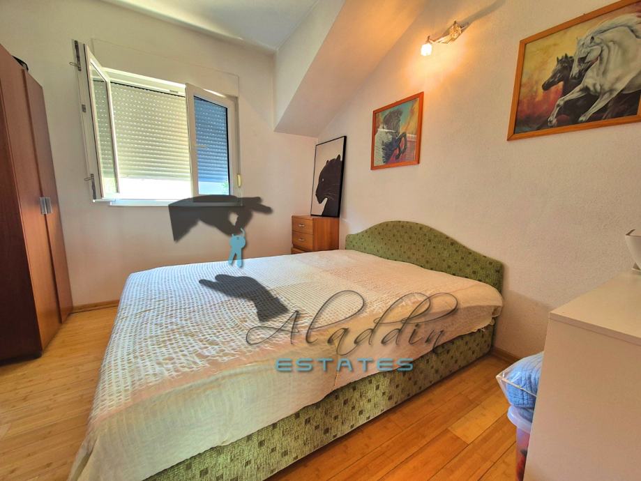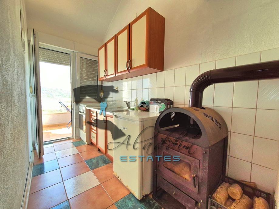 A very spacious and attractive triple-bedroom apartment in the attic of a residential house in Okrug Gornji, featuring beautiful sea view. It consists of a living room combined with dining room, kitchen, three bedrooms, two bathrooms, anteroom, hallway, an extremely generous terrace (partially covered) and a smaller terrace. In 2009, a part of the terrace was closed off and converted into an additional kitchen. All in all, the apartment provides 96 m2 of net living space with coefficients, offering very high sloping ceiling of up to 4m in height.