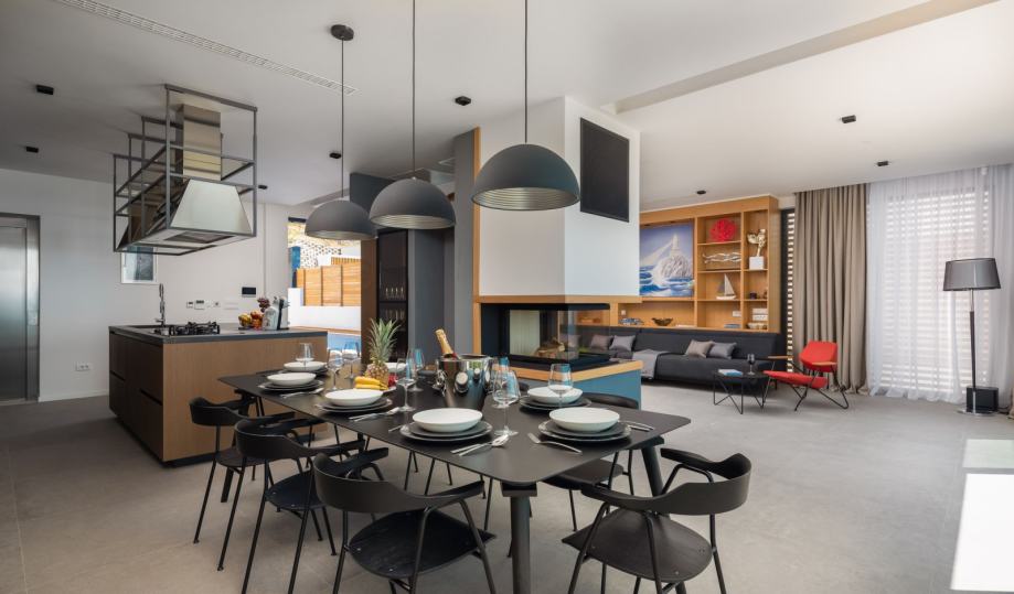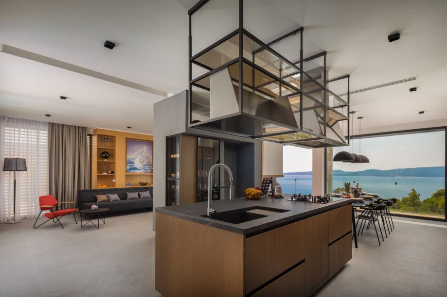 S krovne terase pruža se spektakularan i neometan pogled na otoke Brač, Hvar i Korčulu i cijelu Makarsku rivijeru. Na krovnoj terasi koja se prostire na 93 m2 nalazi se ljetna kuhinja sa plinskim roštiljem, kameni sudoper, mini hladnjak, ledomat, blagovaonski stol za osam osoba, dvije bioklimatske pergole i dodatni prostor za druženje i sunčanje.
