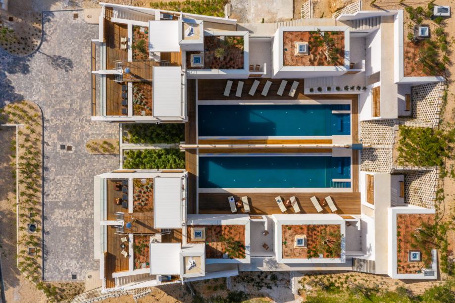 Komunikacija od prizemlja do krova se odvija dizalom ili stepenicama. Vila je specifična po zelenim krovovima povrh sobe i dnevnog boravka i na svakoj od tih krovova nalazi se stablo masline okruženo mediteranskim biljem. Osim što je