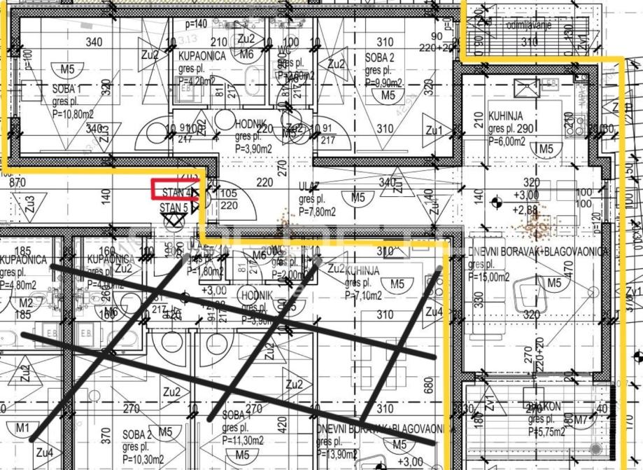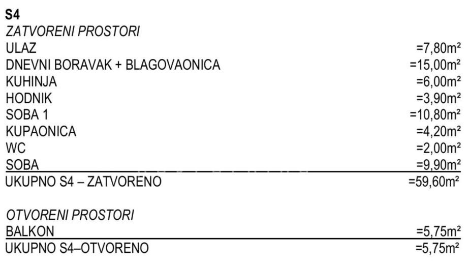 Iz ponude izdvajamo stan S4 koji se nalazi na 1. katu, a sastoji se od: ulaznog dijela, dnevnog boravka i blagavaonice, kuhinje, hodnika, 2 spavaće sobe, kupaonice, zasebnog toaleta i balkona površine 5,75m2 (koef. 0,50).
