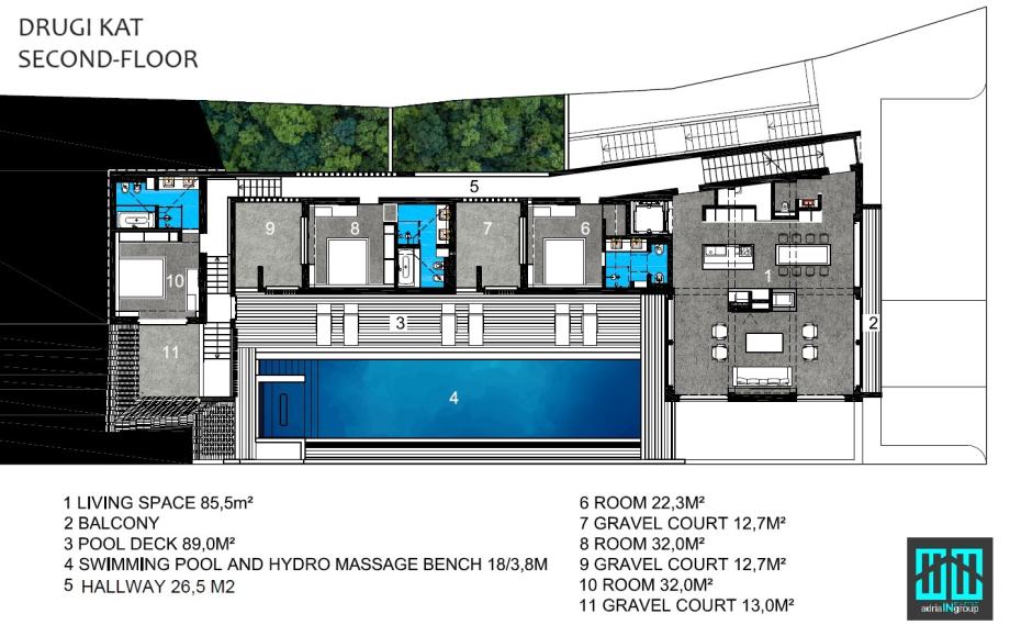 - 2.KAT: prostrani dnevni boravak s kuhinjom i blagovaonom s izlazom na terasu sa bazenom, 3 spavaće sobe s kupaonicama