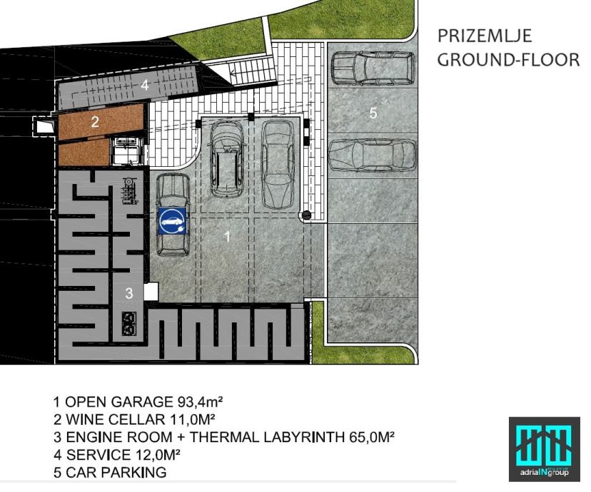 - PRIZEMLJE: garaža 94m2, vinski podrum, natkriveni parking, punionica za električni automobile, strojarnica...
