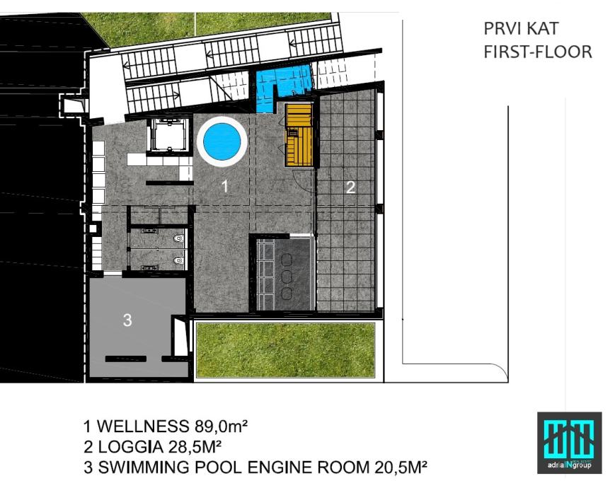 - 1.KAT: wellness i spa, teretana, jacuzzi, sauna, dnevni boravak i kuhinja...