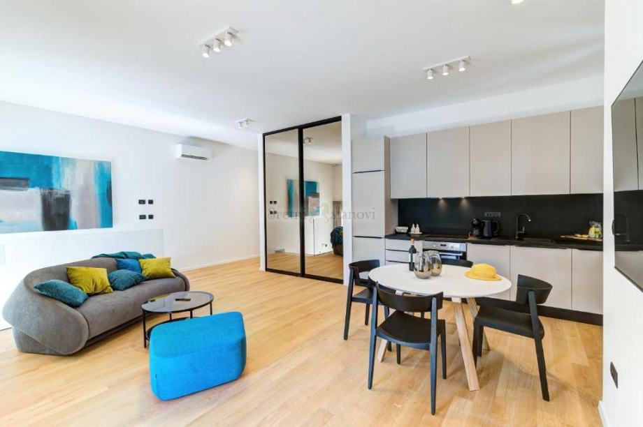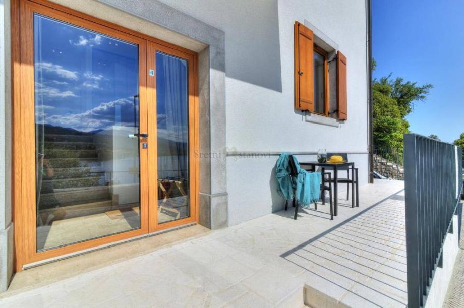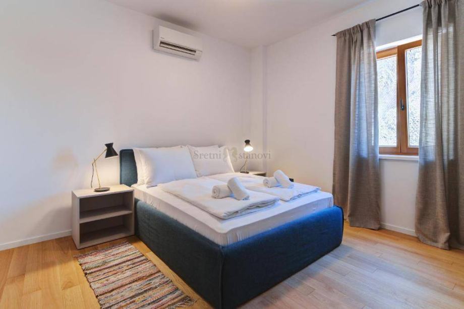 Moderan, luksuzno opremljeni stan u zgradi, prvi red do mora nalazi se pored mjesta Volosko. Stan je u zgradi u visokom prizemlju i ima lijepu terasu. Sastoji se od ulaznog prostora, jedne spavaće sobe, dnevnog boravka, kuhinje s jedaćim dijelom, kupaone i garderobnog dijela. Grijanje je podno i klimatizacija za hlađenje. Stan je namješten , opremljen, a internet je aktivan. Parkirno mjesto je u velikoj garaži. Za lijepog vremena, stan ima vrt/okućnicu iz koje se pruža pogled na cijeli Kvarner. Stan se iznajmljuje do 15.5. Režije se plaćaju posebno. Prekrasna lokacija uz more kraj Voloskog Opatija.