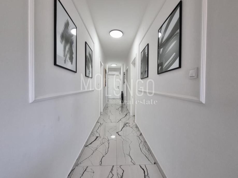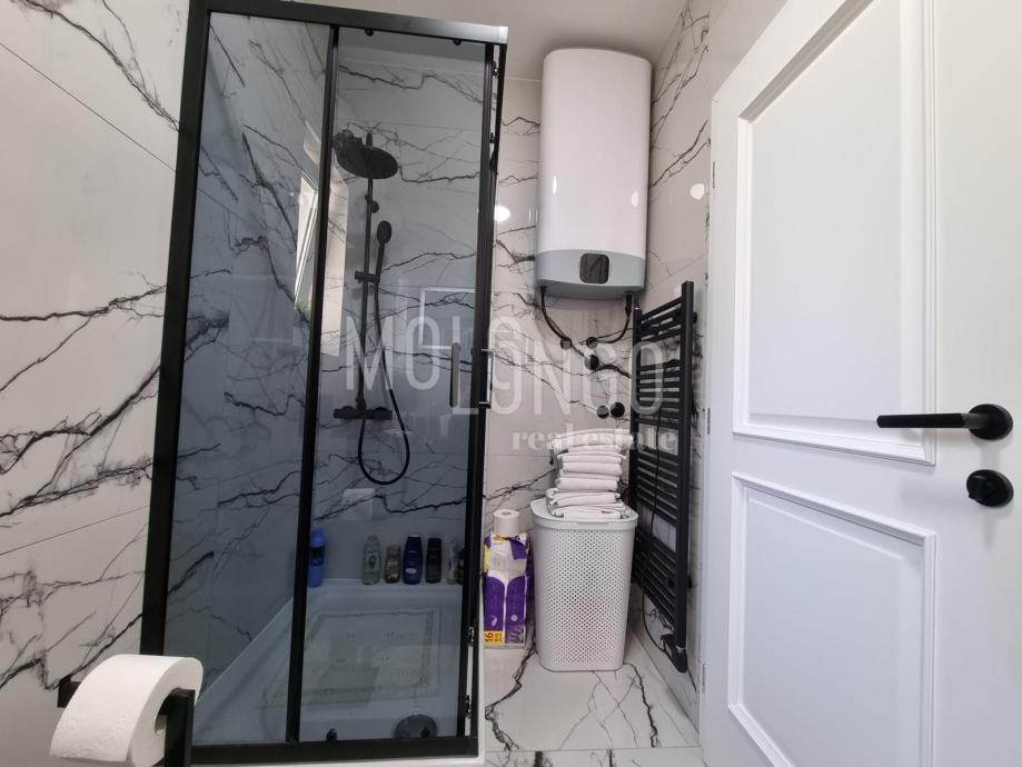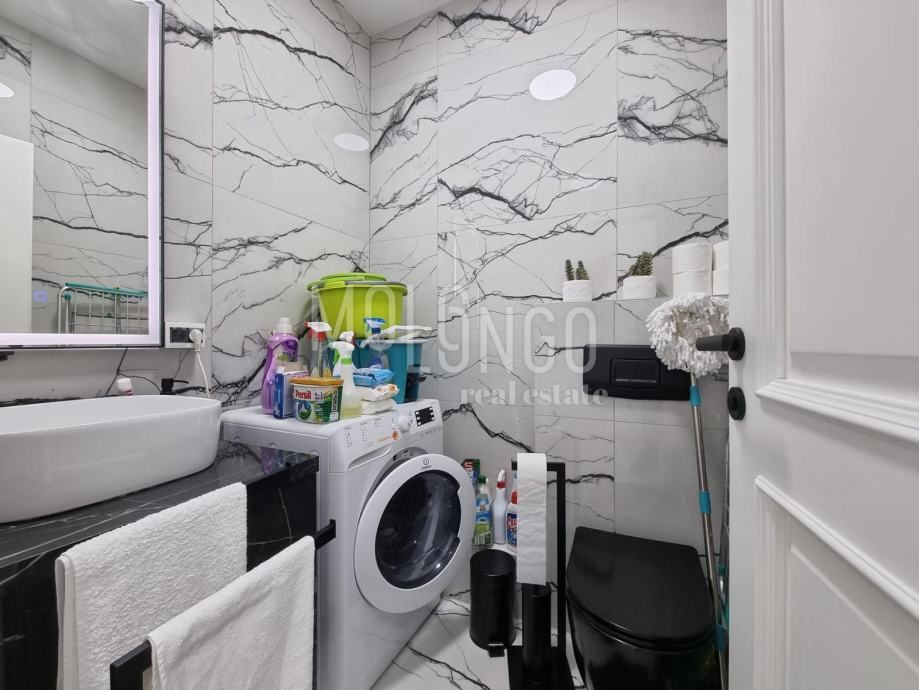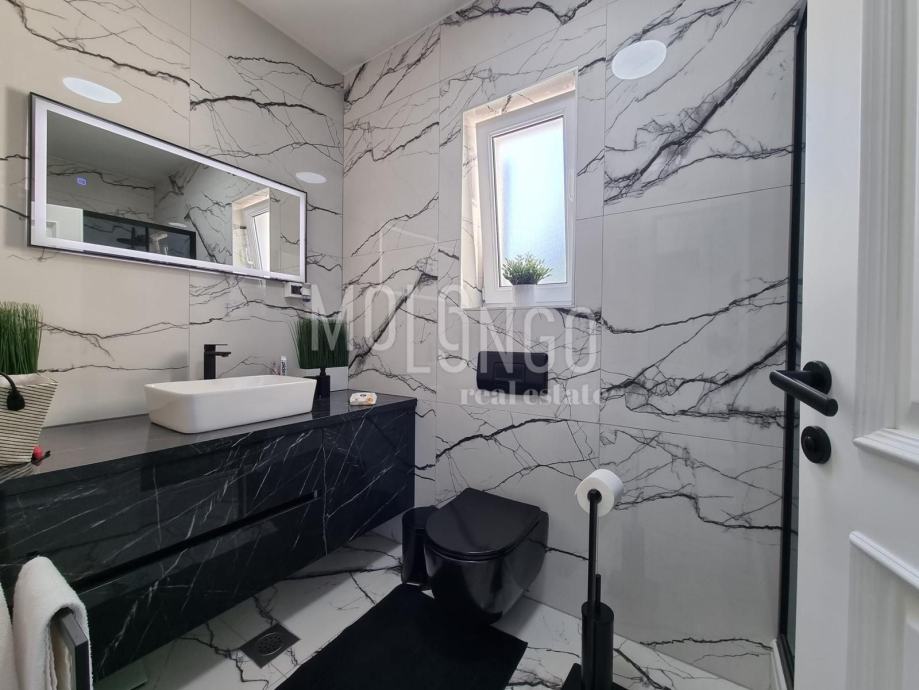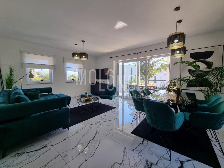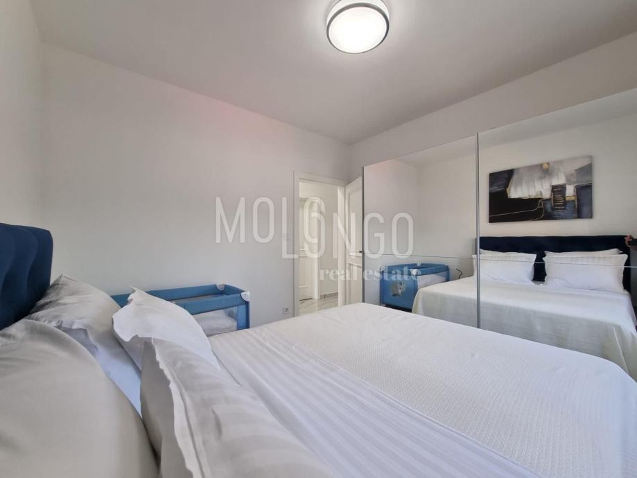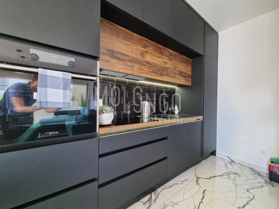 Stan je vrlo kvalitetno namješten i opremljen. Sastoji se od dvije spavaće sobe, kuhinje, kupaone, dnevnog boravka, terase sa pogledom na more te parkirnog mjesta pod rampom.