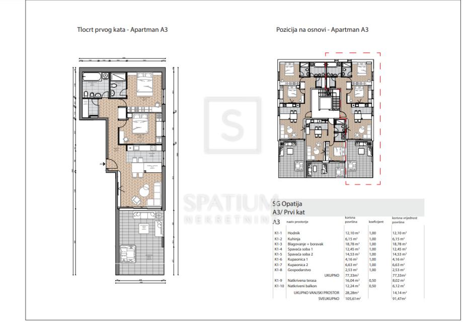 OPATIJA, u ponudu smo dobili luksuzan apartman na drugom katu novogradnje. Sastoji se od hodnika, dnevnog boravka s kuhinjom i blagovaonom, dvije spavaće sobe, dvije kupaonice te natkrivene terase i balkona, sveukupne površine 91,47 m2. Bit će opremljen prvoklasnim podnim oblogama, sanitarijama, aluminijskom stolarijom. Uz to, u zgradi će biti podzemna garaža i lift koji će voditi direktno iz garaže na katove.
