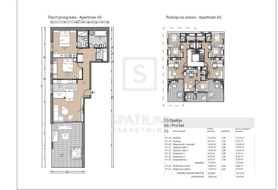 OPATIJA, u ponudu smo dobili luksuzan apartman na prvom katu novogradnje. Sastoji se od hodnika, dnevnog boravka s kuhinjom i blagovaonom, dvije spavaće sobe, dvije kupaonice te natkrivene terase i balkona, sveukupne površine 91,47 m2. Bit će opremljen prvoklasnim podnim oblogama, sanitarijama, aluminijskom stolarijom. Uz to, u zgradi će biti podzemna garaža i lift koji će voditi direktno iz garaže na katove.