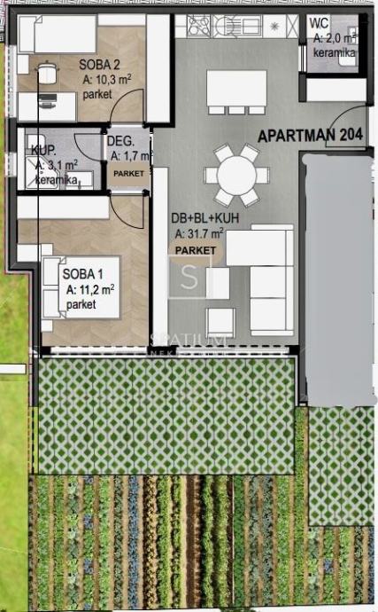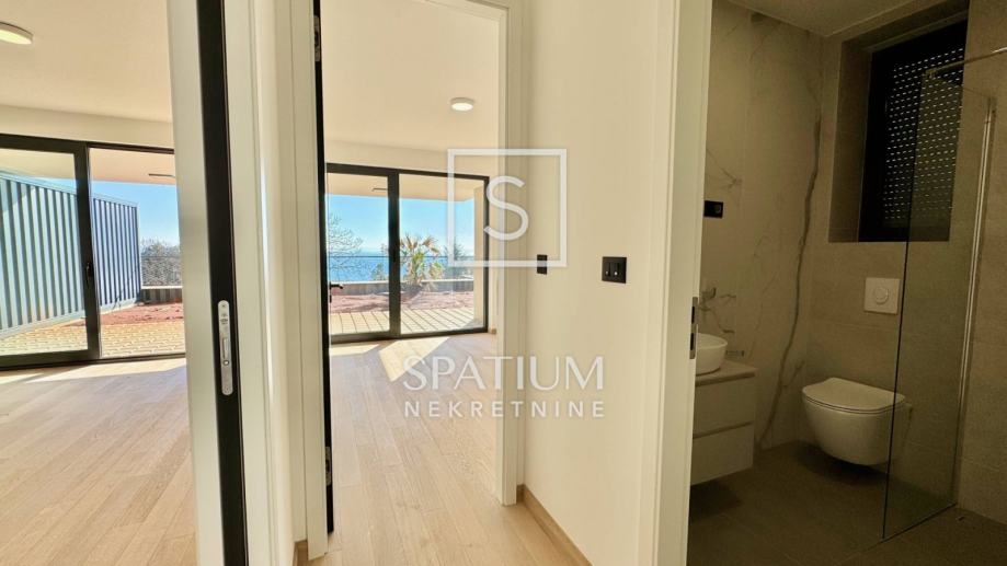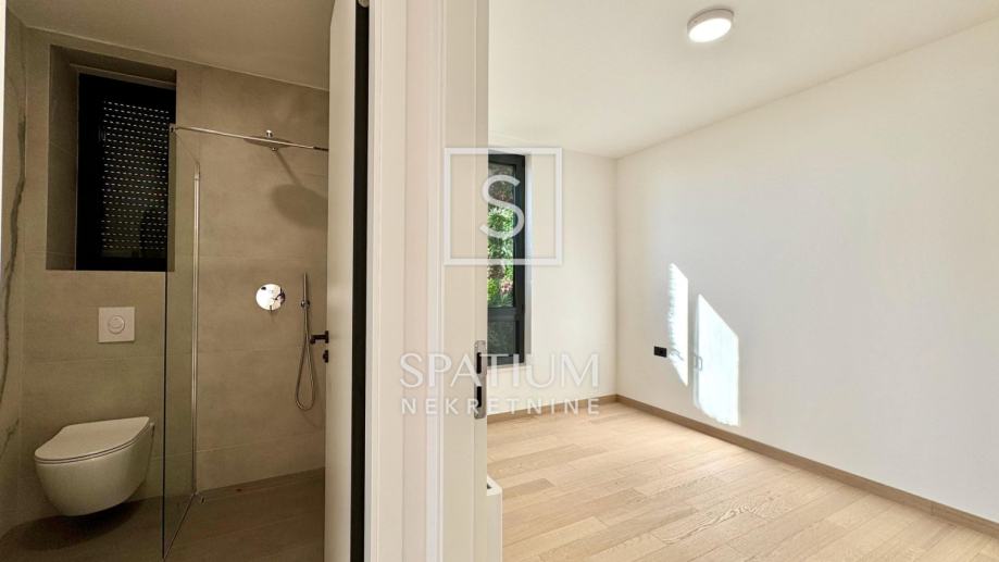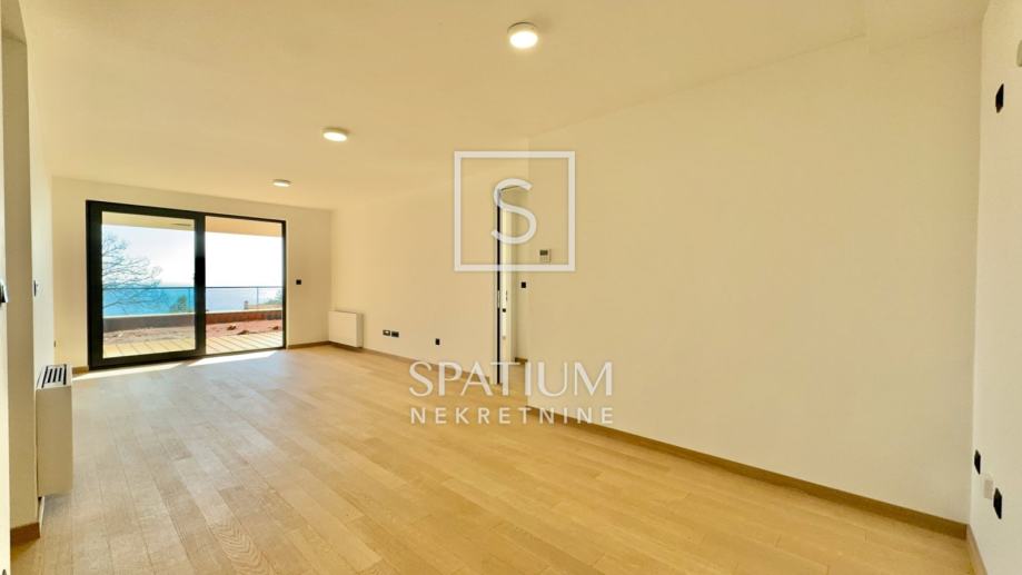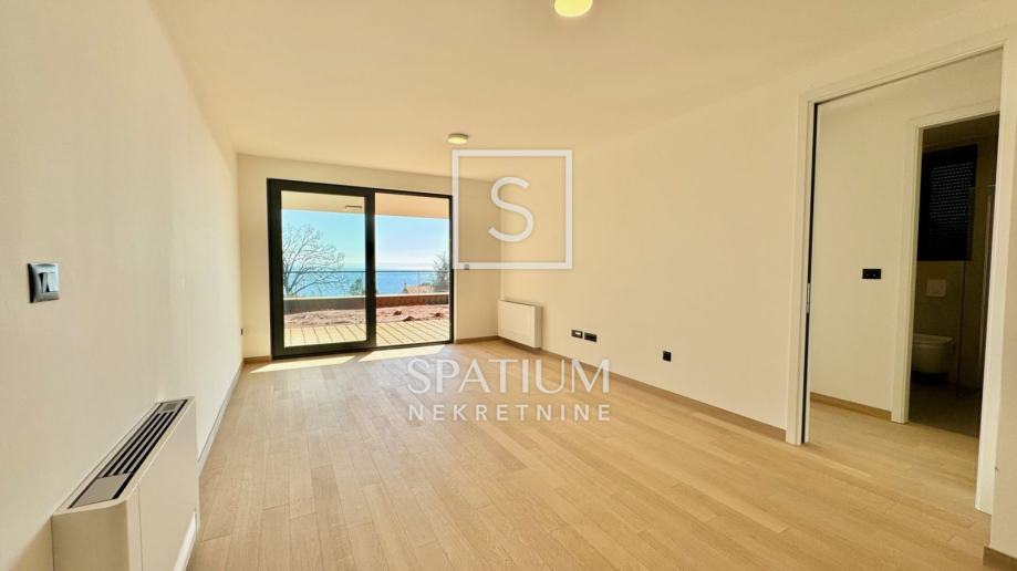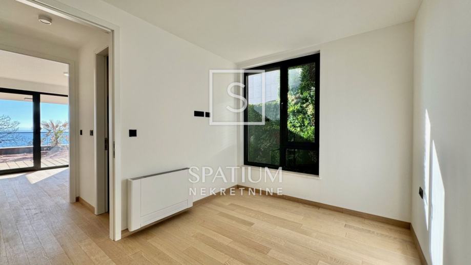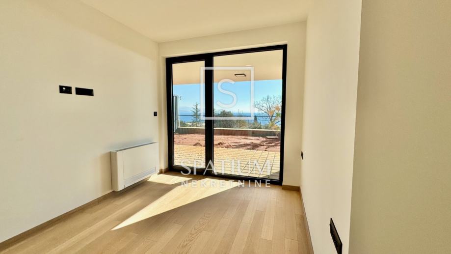 OPATIJA, u ponudi je apartman s velikom okućnicom u prizemlju izvrsne novogradnje na pješačkoj udaljenosti od prve plaže i centra Opatije. Apartman ima 57 metara kvadratnih korisne površine, jedno garažno parking mjesto i malo više od 112 metara kvadratnih okućnice s koje se pruža pogled na more. Pogled na more ne izostaje iz glavne spavaće sobe i prostranog dnevnog boravka koji je dio velike središnje prostorije u kojoj je još i kuhinja te mjesto za blagovaonski stol. Dvije spavaće sobe dijeli moderno uređena kupaonica dok je gostinjski toalet pored glavnog ulaza. Unutrašnji prostor ispunjen je prirodnim svjetlom zahvaljujući velikim staklenim stijenama koje ujedno odlikuje odlična zvučna izolacija. Prilikom opremanja korištene su visokokvalitetne podne i zidne obloge te unutrašnja i vanjska stolarija. Prostrana okućnica nudi dovoljno prostora za stvaranje zelene oaze mira za bezbrižno uživanje u društvu obitelji i prijatelja.