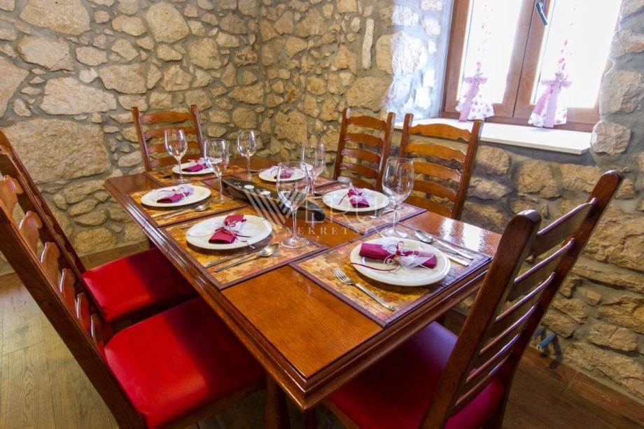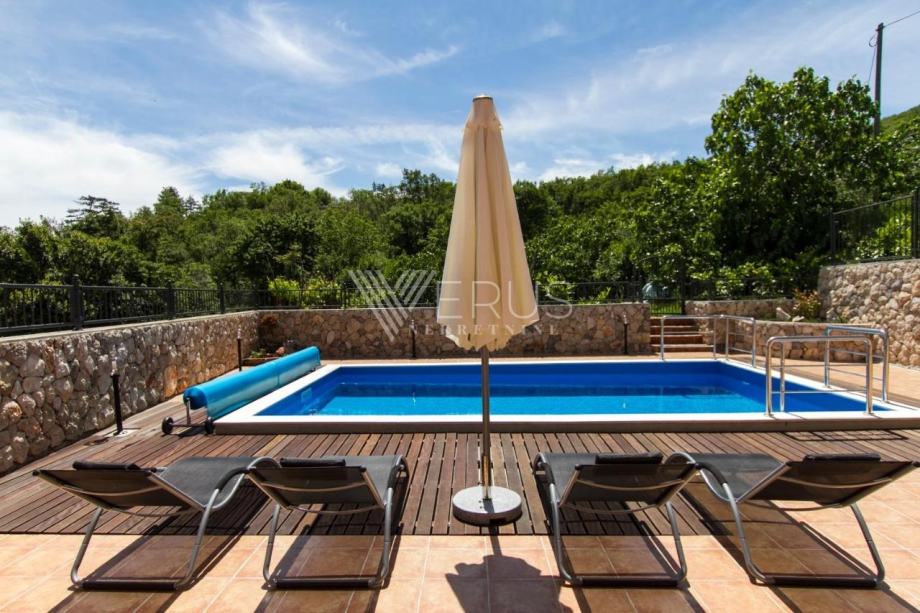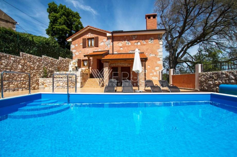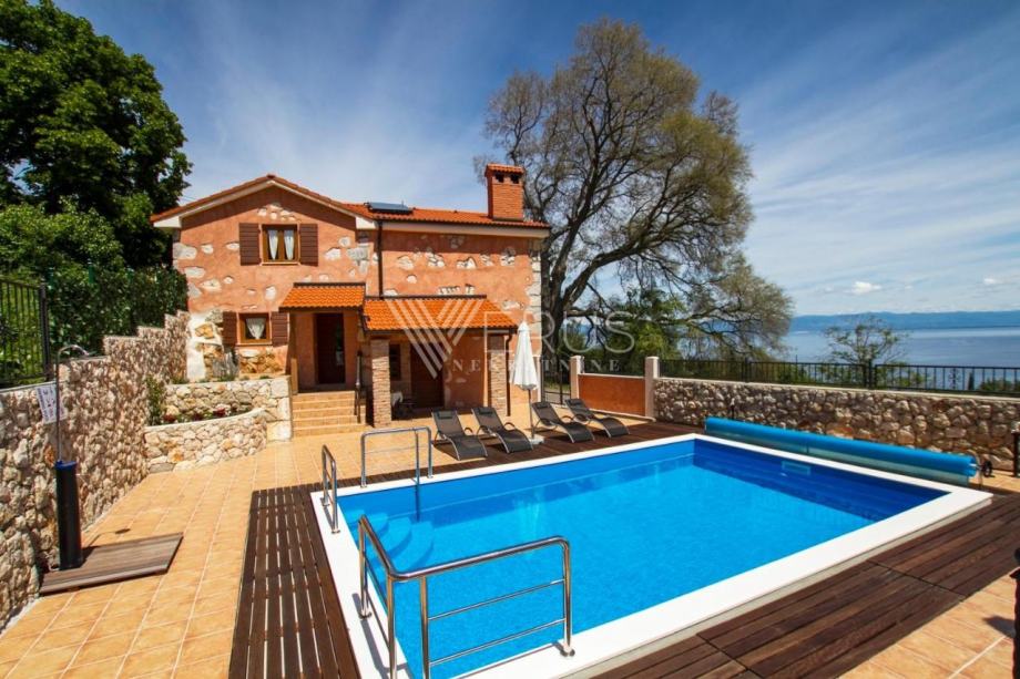 Prodajemo prekrasnu kamenu villu na atraktivnoj lokaciji u blizini Opatije. Nalazi se u malenom mjestašcu sa svega nekoliko susjednih kuća. U naravi je to stara kamena kuća koja je kompletno obnovljena i uređena u spoju starog i modernog štiha. Sastoji se od prizemlja i kata. U prizemlju se nalaze dve spavaće sobe,kupaonica s wc-om, konoba i terasa. Na katu koji je spojen unutarnjim stepenicama se nalazi kuhinja i blagavaonica, dnevni boravak s francuskim balkonom, velika spavaća soba te kupaonica s wc-om. Kuća je kompletno namještena te se kao takva i prodaje. Grijanje i hlađenje je na klima inverter uređaj, centralno grijanje na kruta goriva te kamin za pravi topli ugođaj.Također na kuću su postavljeni solarni paneli za grijanje tople vode. Na prostranoj okućnici se nalazi vanjski bazen, sunčalište te uređen i kultiviran vrt s raznoraznim mediteranskim biljem. Također kući pripadaju i dva parkirna mjesta koja su natkrivena nadstrešnicom.